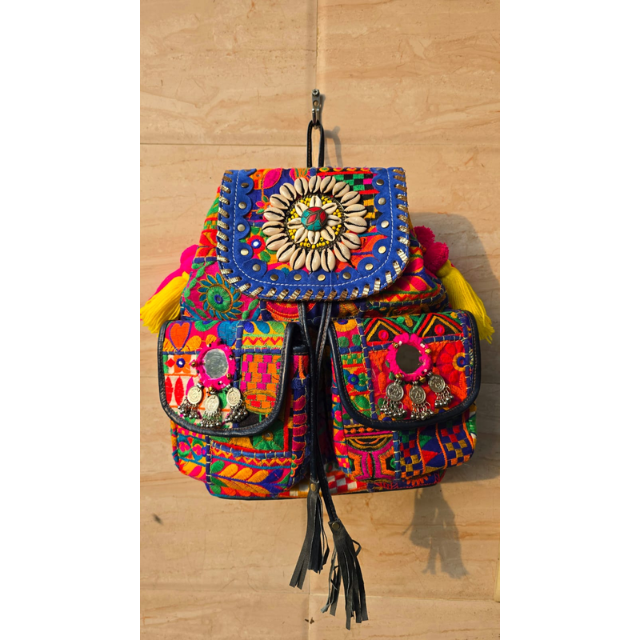 กระเป๋าโท้ทปักลายชนเผ่าด้วยมือ ประดับด้วยเหรียญกระจกทรงชิชาตรงกลาง ฝังเปลือกหอยโข่งแท้ และสีสันสดใส