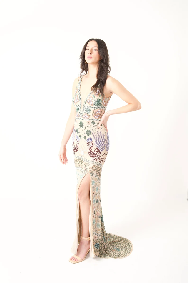 ชุดราตรีปักลายดอกไม้ปักเลื่อมและลูกปัดชุดราตรีแขนกุดทรงคอวีลึกสำหรับงานปาร์ตี้