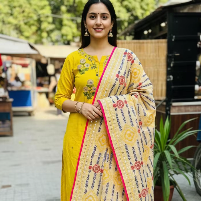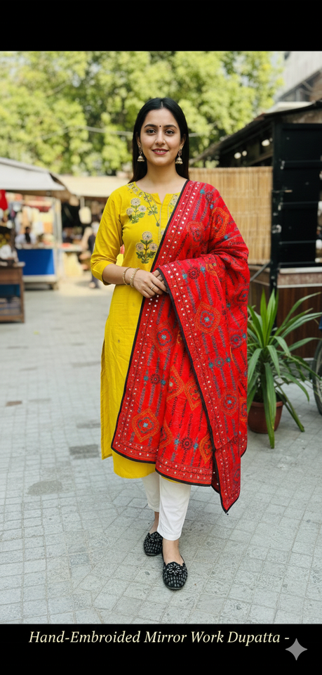 ผ้าคลุมไหล่ปักมือลายกระจกเงาและชุดคุर्ตาสีเหลืองสดใส เหมาะสำหรับงานเทศกาลและงานเฉลิมฉลองทางวัฒนธรรม