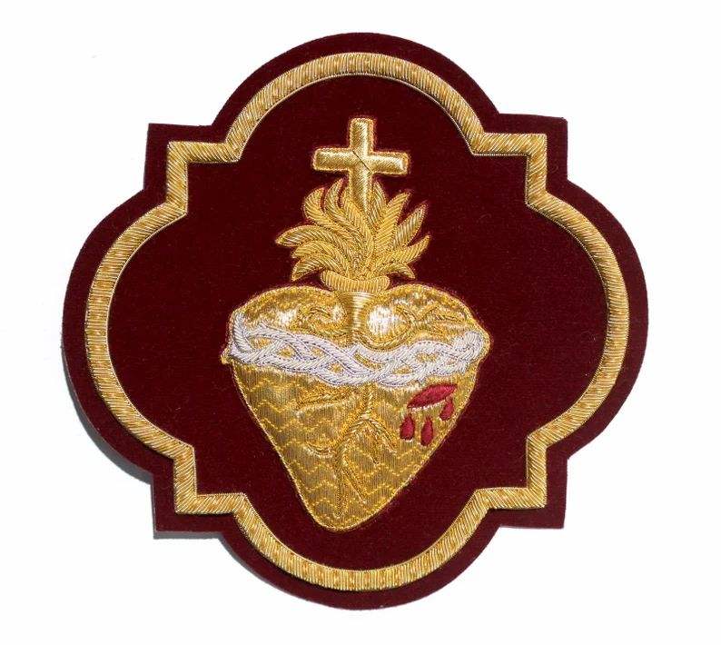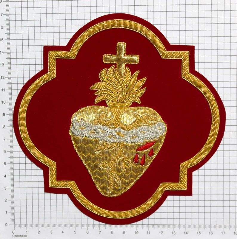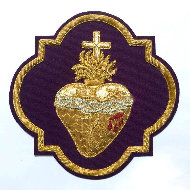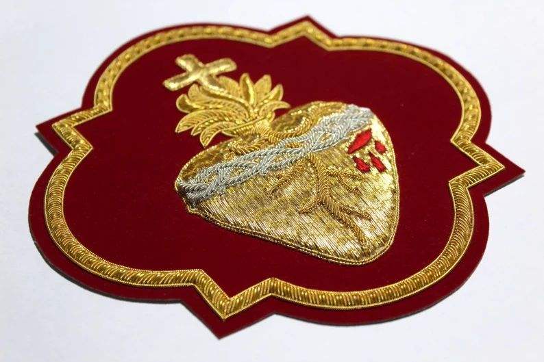 ตราประดับรูปหัวใจศักดิ์สิทธิ์ปักมือด้วยดิ้นทองหรูหรา ทนน้ำ พร้อมเอฟเฟกต์นูน 3 มิติ