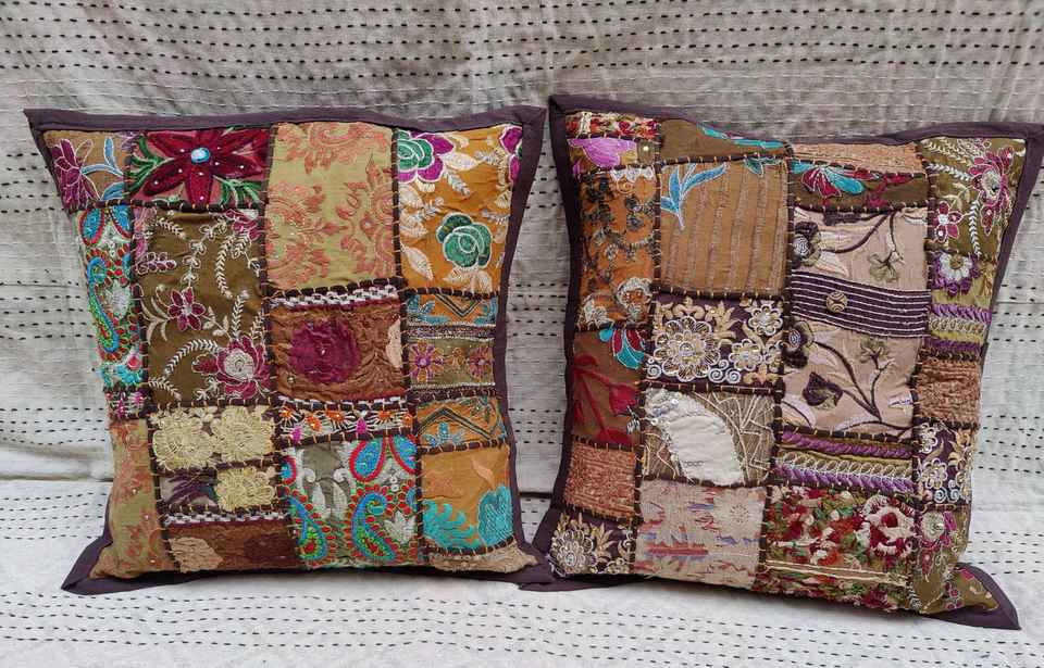 Hand Embroidered Striped Magnetic Patchwork Throw Pillow Covers in Recycled Fabric Vintage Kantha Boho Home Decor