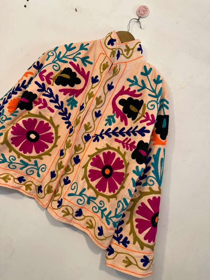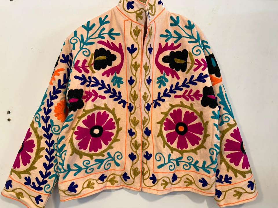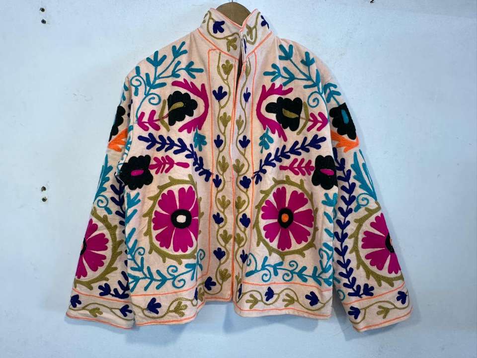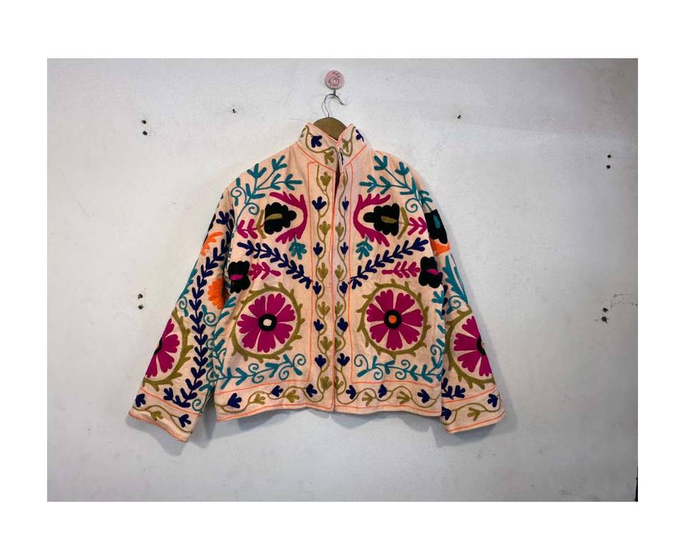 เสื้อแจ็คเก็ตปักมือลายซูซานี เสื้อโค้ทปักลายดอกไม้ เสื้อแจ็คเก็ตฤดูหนาวแบบยูนิเซ็กซ์ สไตล์โบฮีเมียนฮิปปี้ เสื้อคลุมผ้าฝ้ายปักลาย