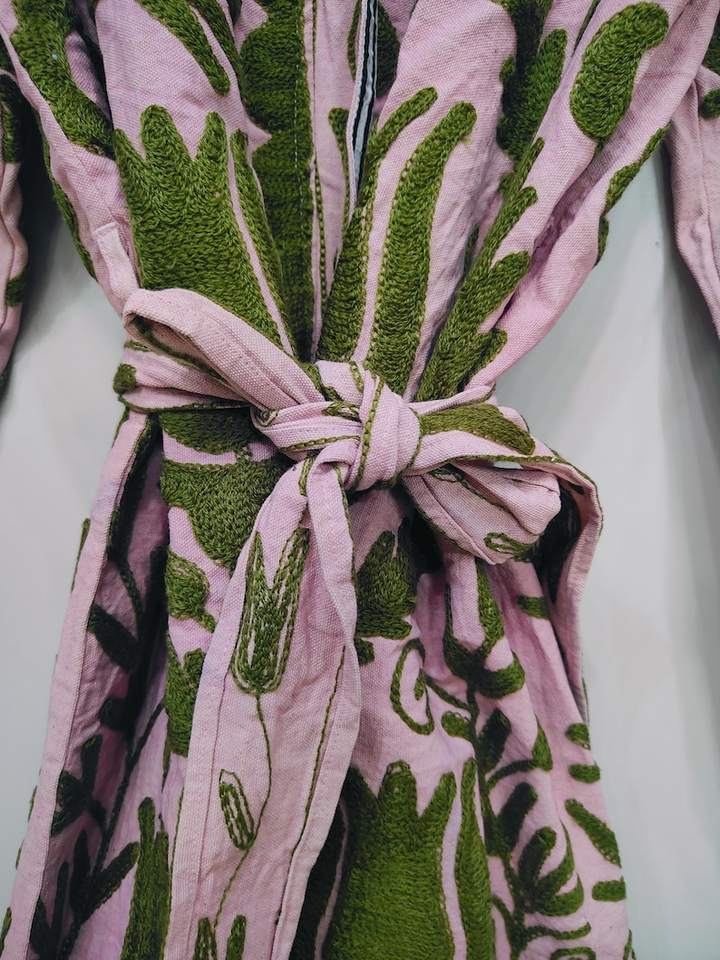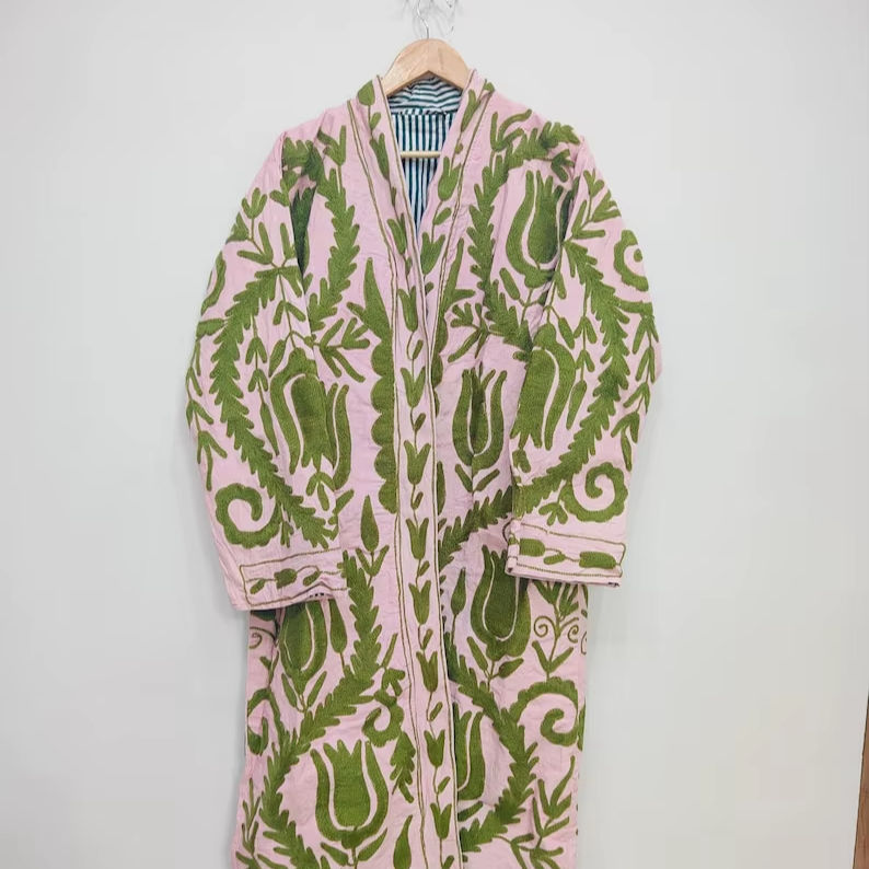 Suzani ปักด้วยมือแจ็คเก็ตชุดกิโมโนสีเขียวเสื้อคลุมสำหรับผู้หญิงเสื้อคลุมฤดูหนาวพร้อมเข็มขัดทำด้วยมือสไตล์โบฮีเมียนของขวัญสำหรับเธอ