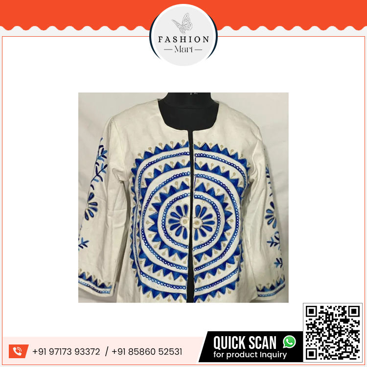 High Quality Hand-Embroidered White Cotton Suzani Jacket Women Unique Bohemian Style Intricate Blue Floral Mandala Motifs Button