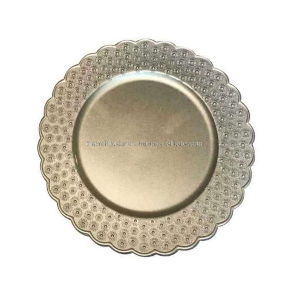จานและจานโลหะสำหรับเครื่องครัวขอบแกะสลักด้วยมือถาดเสิร์ฟอาหารจานสแตนเลสสำหรับบริกรเสิร์ฟโลหะ