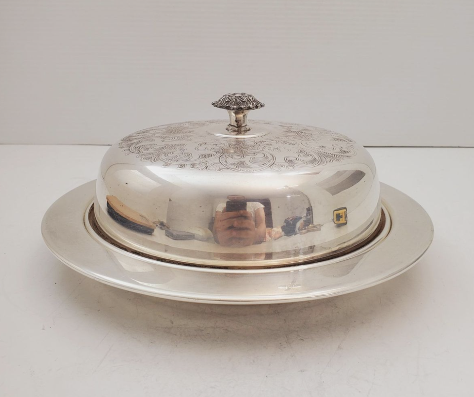 จานชีสโลหะสำหรับตกแต่งงานแกะสลักด้วยมือพร้อมจานเนยสำเร็จรูปชุบนิกเกิลสำหรับงานเลี้ยงอาหารเช้า