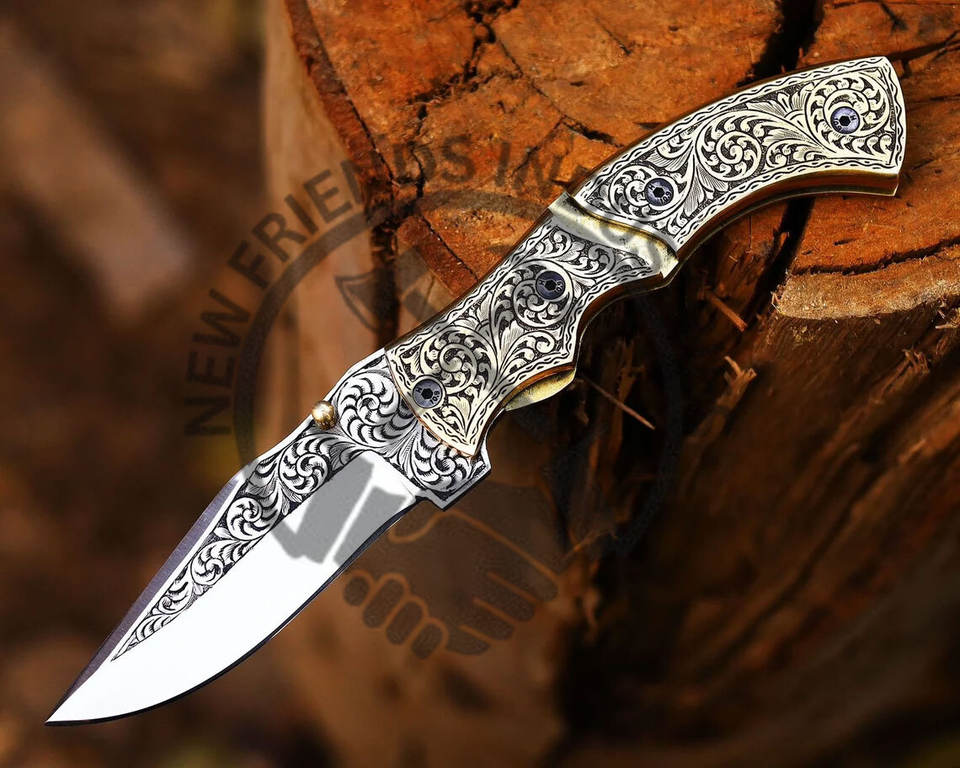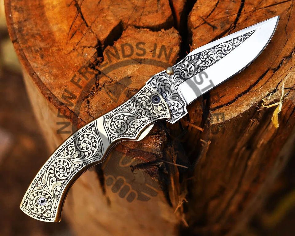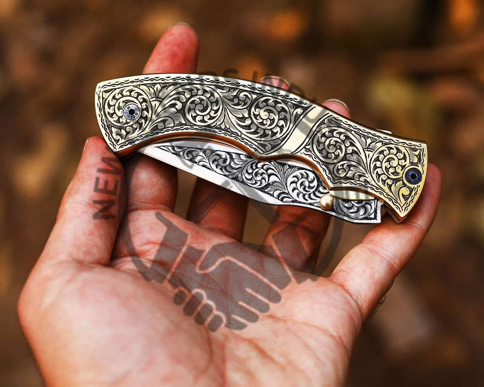 มีดพกที่แกะสลักด้วยมือพับได้พร้อมด้ามจับทองเหลืองสลัก D2ใบมีดเหล็กกล้าล็อคได้ง่ายของขวัญมีดล่าสัตว์สำหรับคุณพ่อเขา