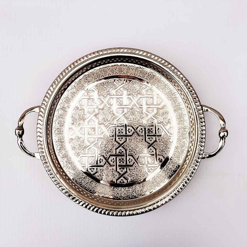 ถาดเสิร์ฟทองเหลืองชุบเงินโมร็อกโกแกะสลักด้วยมือ พร้อมหูจับ ถาดชาโลหะทรงกลมสไตล์โอเรียนทอล สำหรับตกแต่งบ้านและห้องครัว