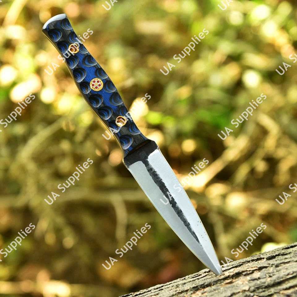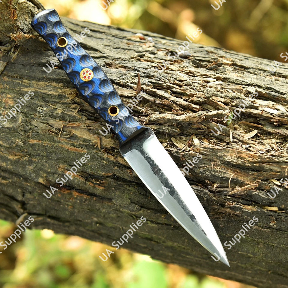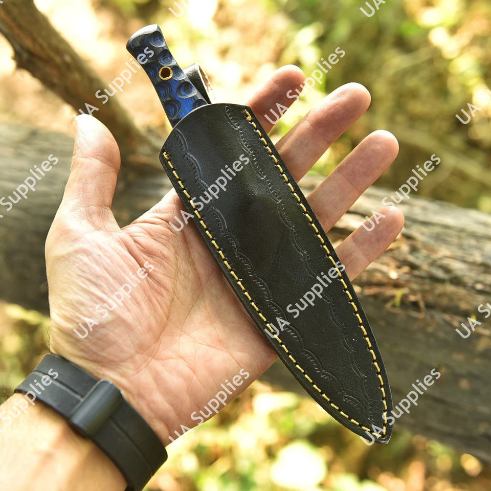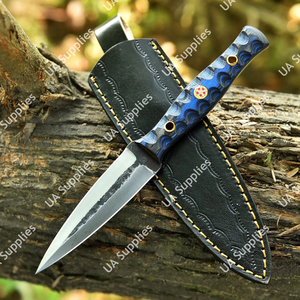 มีดล่าสัตว์เหล็กกล้าคาร์บอน 1095 ตีขึ้นรูปด้วยมือ พร้อมด้ามไม้ปักก้า ปลอกหนัง มีดแคมป์ปิ้งเกรดอุตสาหกรรม คมกริบ