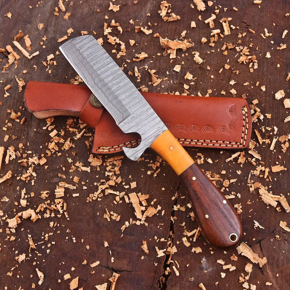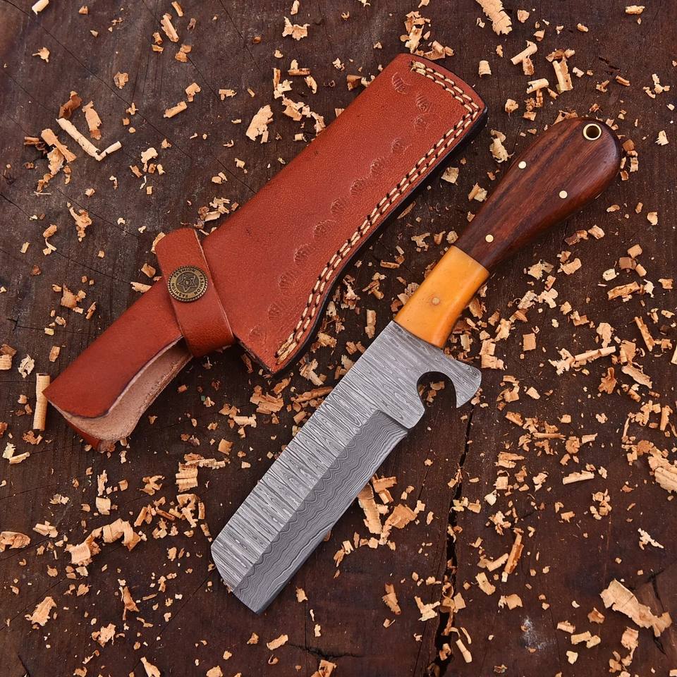 มีดคาวบอยเหล็กดามัสกัสตีขึ้นรูปด้วยมือ ด้ามไม้และกระดูก พร้อมปลอก มีดใบตายแบบฟูลแทงค์ EDC ผลิตตามสั่ง OEM