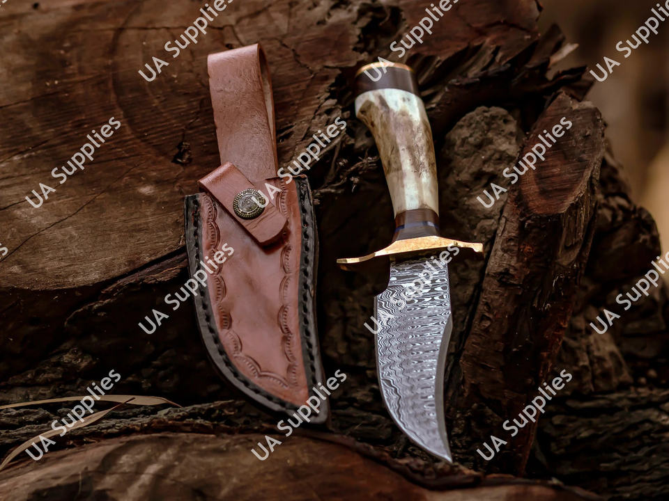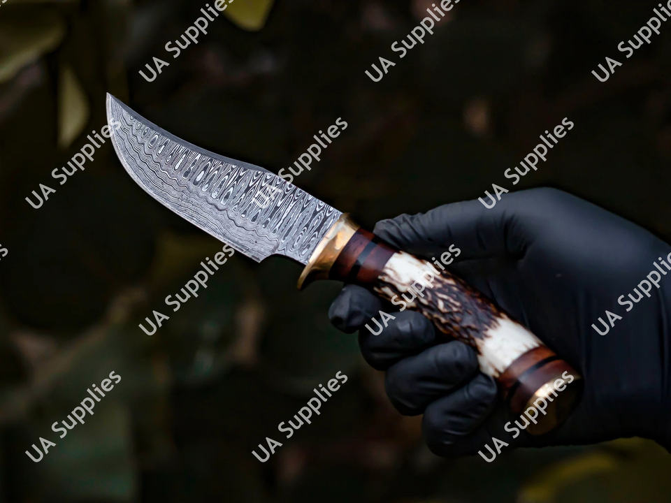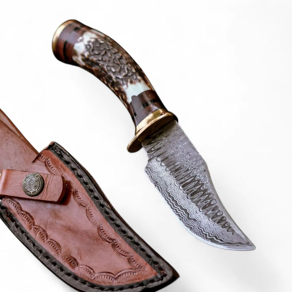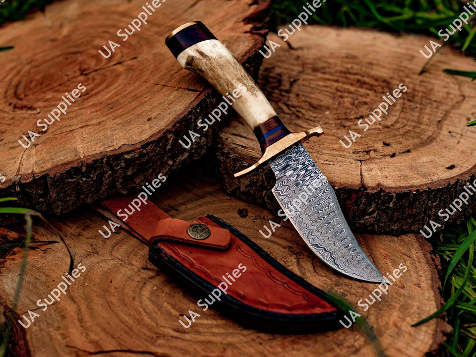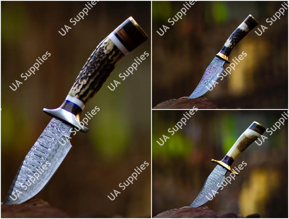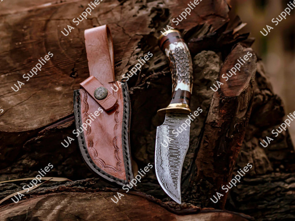 มีดเหล็กดามัสกัสตีขึ้นรูปด้วยมือ ใบมีดคงที่ สำหรับตั้งแคมป์ ล่าสัตว์ ด้ามเขาสัตว์ ขายส่ง รับผลิตแบบ OEM/ODM รองรับการปรับแต่งตามความต้องการ ขั้นต่ำในการสั่งซื้อน้อย