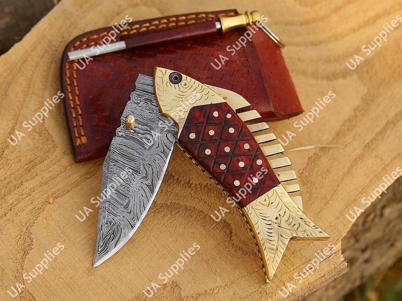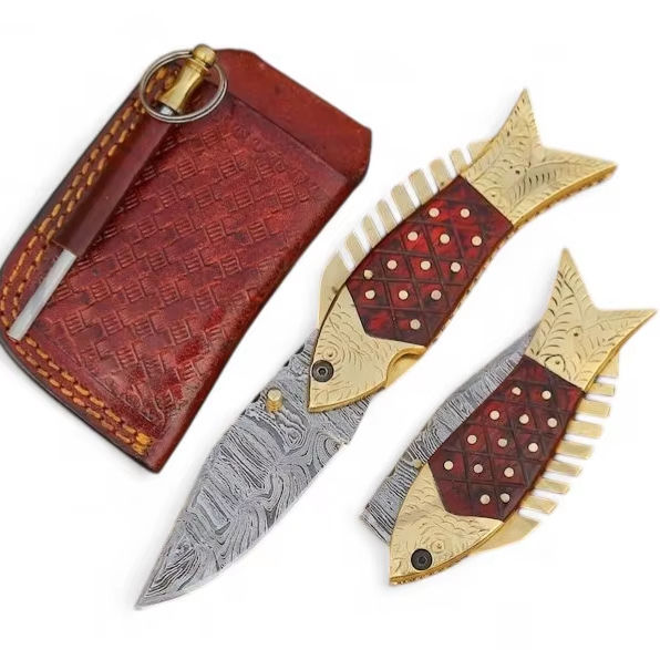 มีดพับเหล็กดามัสกัสตีขึ้นรูปด้วยมือ สำหรับตกปลา พกพาสะดวก ด้ามไม้ทองเหลือง ปลายมีดแบบดรอปพอยต์ ลายปลาสลักมือ ดีไซน์เฉพาะตัว ทำเองได้