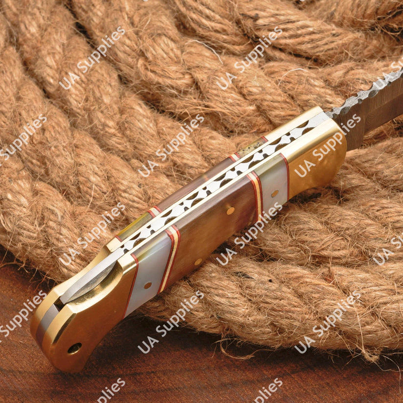 มีดพับเหล็กดามัสกัสตีขึ้นรูปด้วยมือ ด้ามทำจากเขาแกะและทองเหลือง คุณภาพสูง EDC สำหรับยุทธวิธี ล่าสัตว์ ตั้งแคมป์ OEM ODM ขนาด 3 นิ้ว