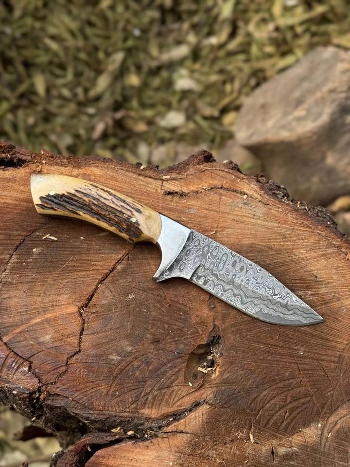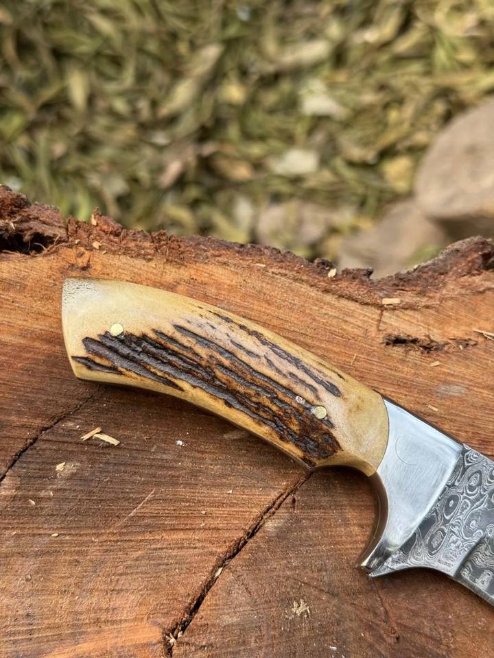 มีดล่าสัตว์เหล็กดามัสกัสตีขึ้นรูปด้วยมือ ด้ามทำจากเขาสัตว์ ผลิตตามสั่ง OEM แบบฟูลแทงค์ มีดแล่หนังลายหยดน้ำดามัสกัส พร้อมปลอกมีด