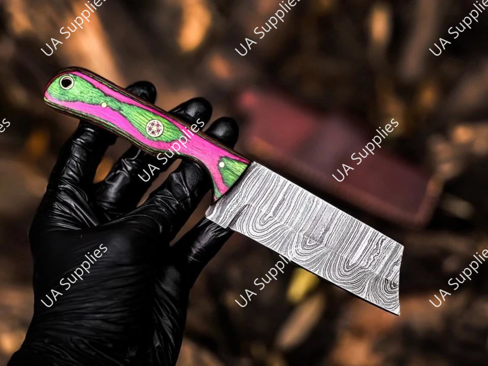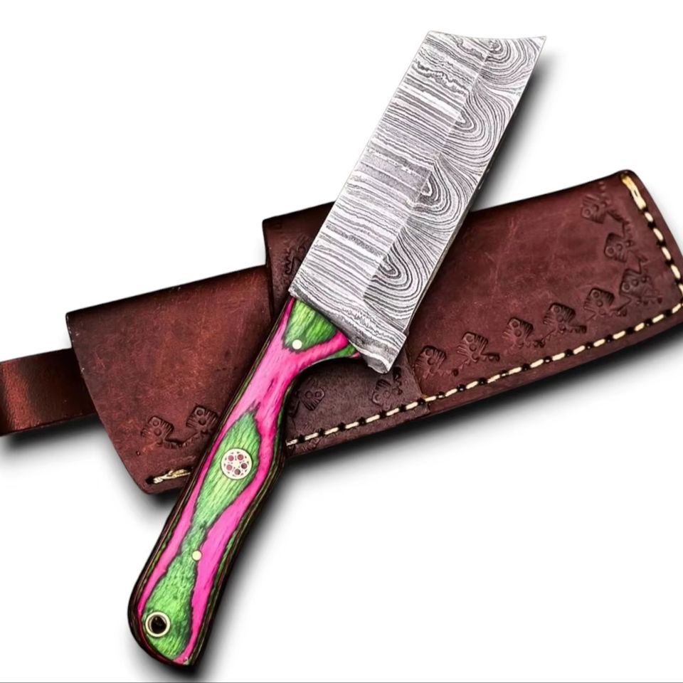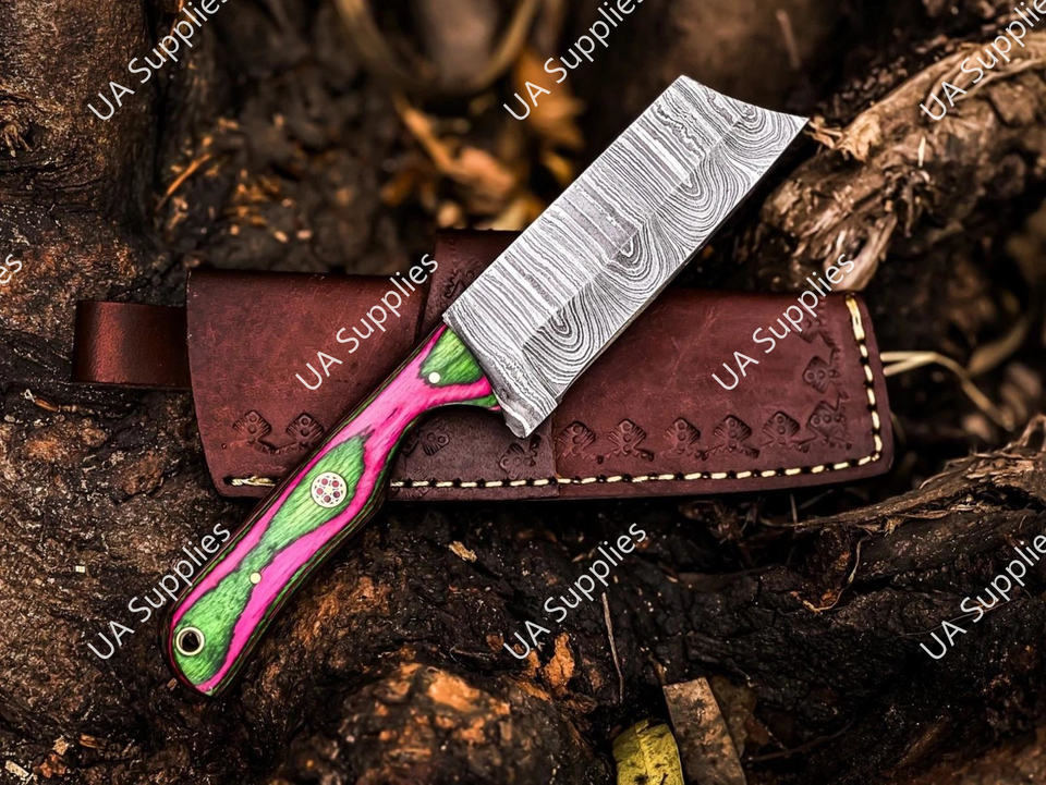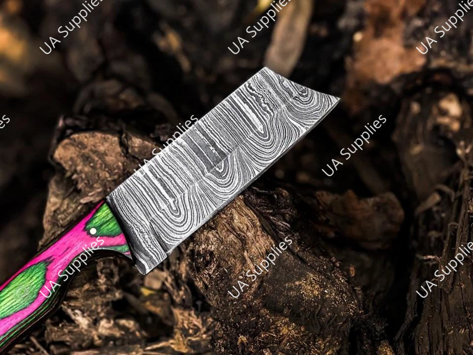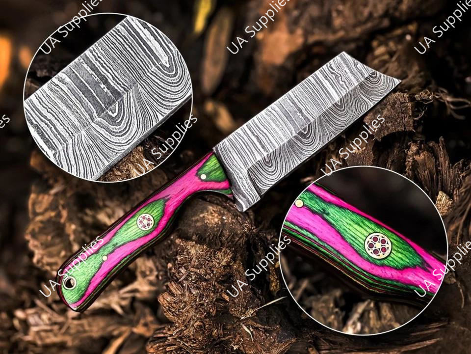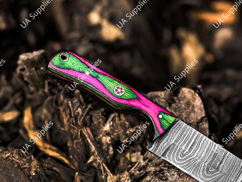 มีดล่าสัตว์เหล็กดามัสกัสตีขึ้นรูปด้วยมือ ใบมีดตรงคมกริบ คุณภาพสูง ด้ามไม้ปักก้าหลากสี รับผลิตตามแบบ OEM คุณภาพดีที่สุด