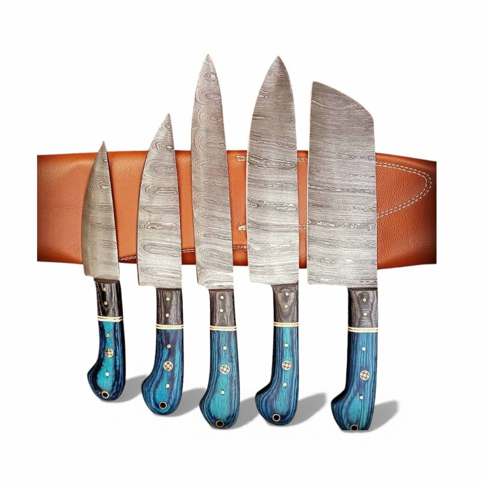 ชุดมีดเชฟสมัยใหม่ตีขึ้นรูปด้วยมือ ใบมีดเหล็กดามัสกัส ด้ามไม้ปักก้า ปลอกหนัง ปรับแต่งความยาวใบมีดได้