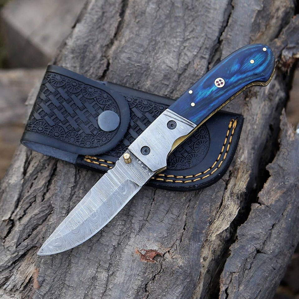 มีดพับล่าสัตว์เหล็กกล้าไร้สนิมตีขึ้นรูปด้วยมือ ด้ามเรซิ่นสีน้ำเงิน ปลอกหนัง ผลิตตามแบบ OEM ใบมีดหยัก ใช้ในชีวิตประจำวัน ของขวัญ