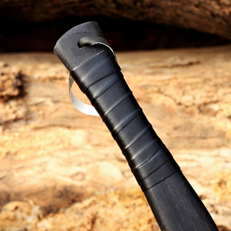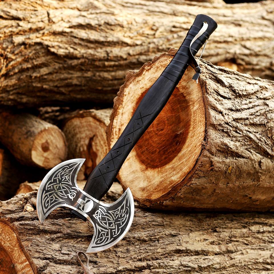 ขวานวิกิ้งสองหัวตีขึ้นรูปด้วยมือ – หัวขวานเหล็กคาร์บอนแกะสลักด้วยกรด, ด้ามไม้แอชเนื้อแข็งพร้อมปลอกหนัง ขวานแบบกำหนดเอง OEM