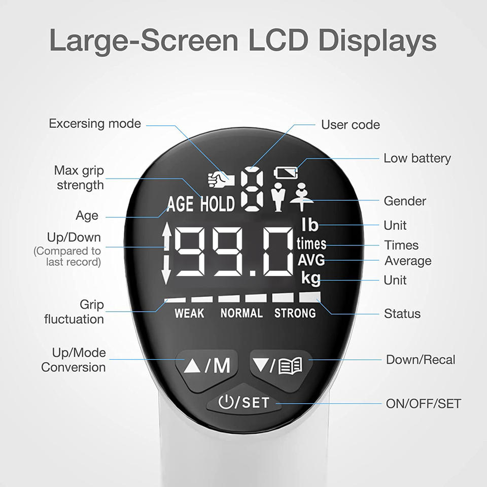 อุปกรณ์เสริมสร้างความแข็งแรงของมือพร้อมจอแสดงผล LED วัดแรงได้ 10.8-49.4 กก. สำหรับการฝึกซ้อมและการฟื้นฟู