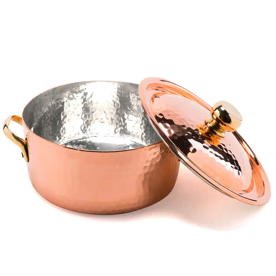 เครื่องครัวทองแดงตีมือพร้อมฝาปิดและหูจับทองเหลือง หม้อโลหะบุดีบุย