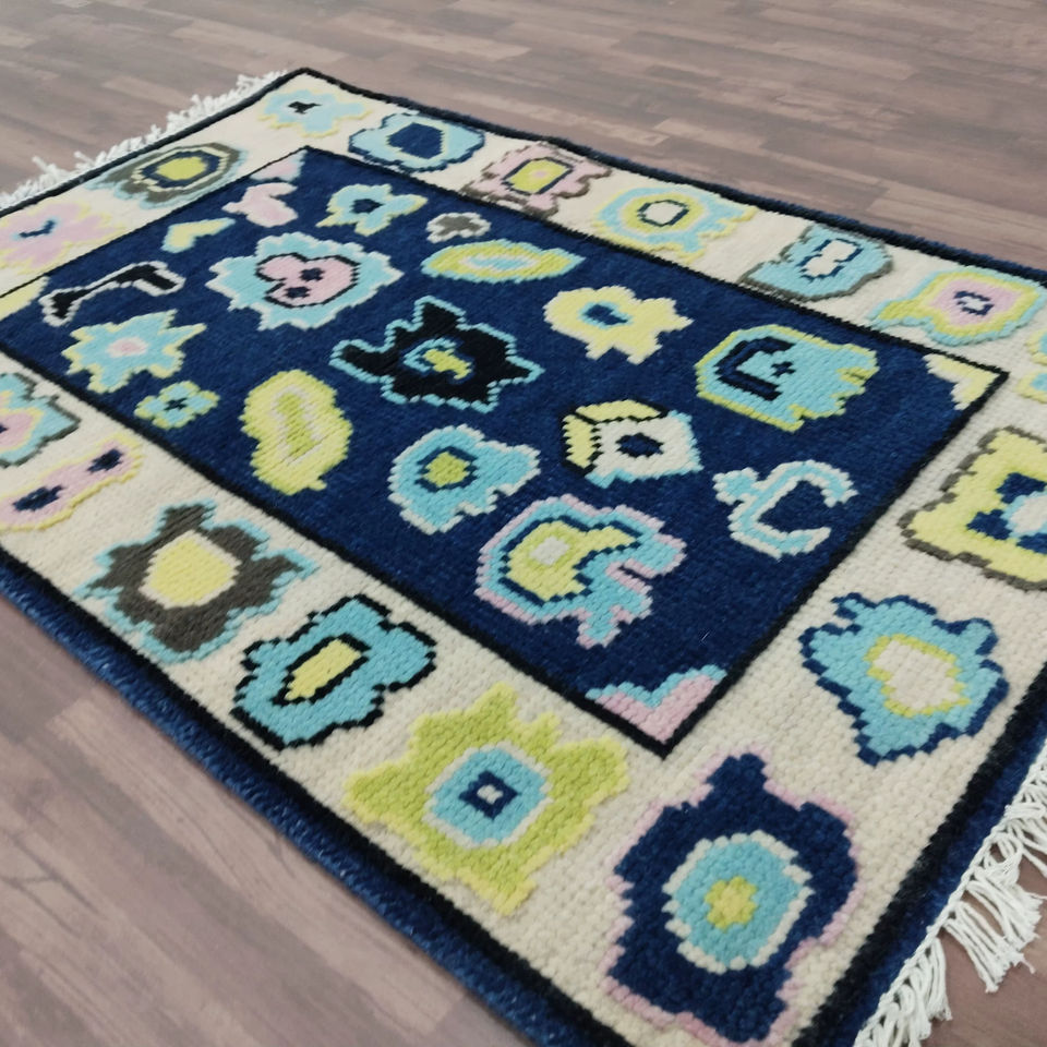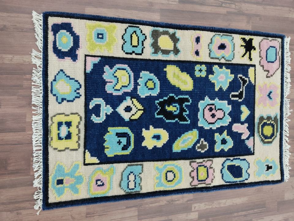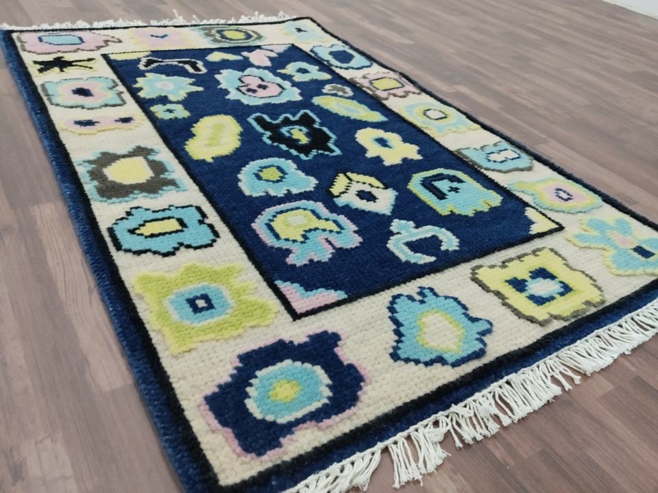 พรมขนสัตว์สีฟ้าพาสเทลลายดอกไม้สไตล์อูชักถักด้วยมือ แบบตัดขน วินเทจ ทำด้วยมือ สำหรับตกแต่งห้องนั่งเล่น