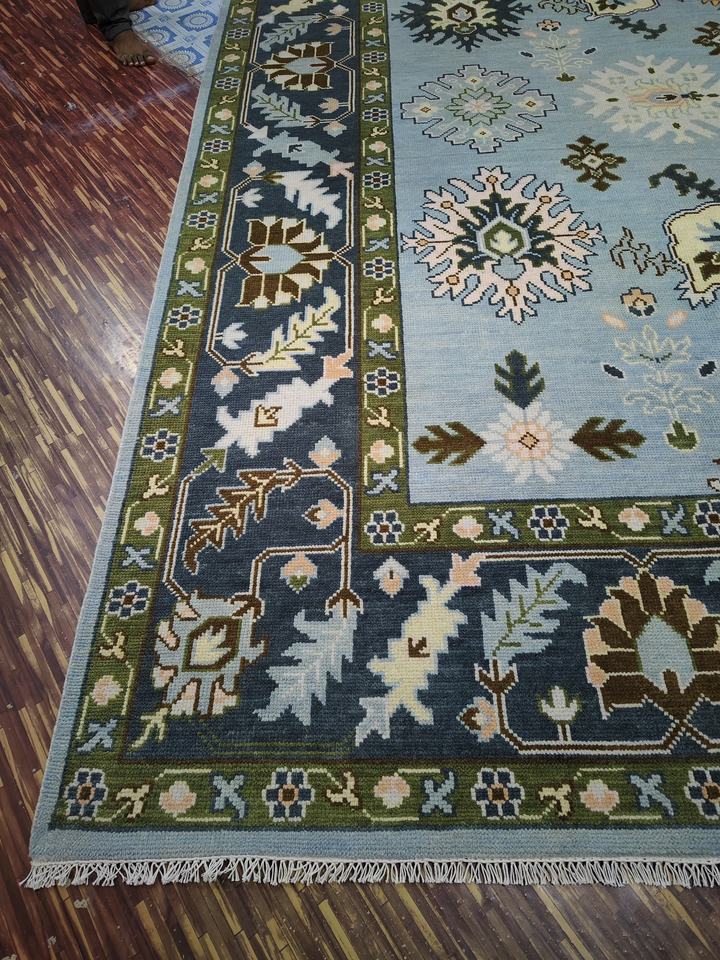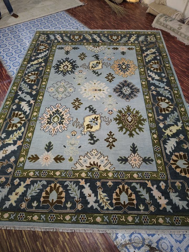 พรม Oushak ขนาดเล็ก ทอมือ:พรมขนสัตว์ทอมือ พรมสไตล์ตะวันออก พรมสีฟ้าเขียว พรมขนสัตว์แบบดั้งเดิม