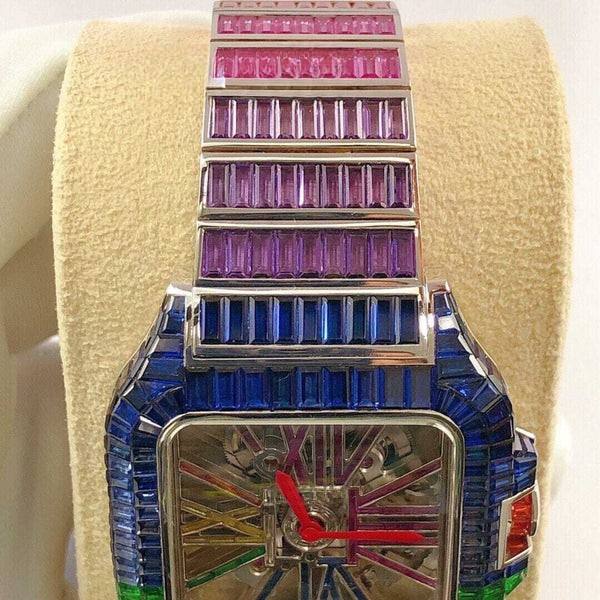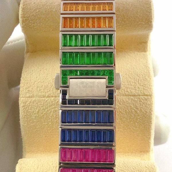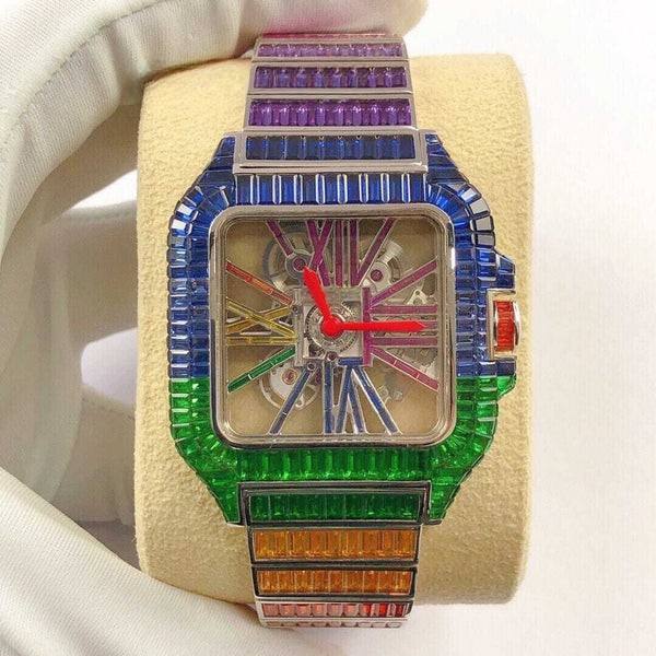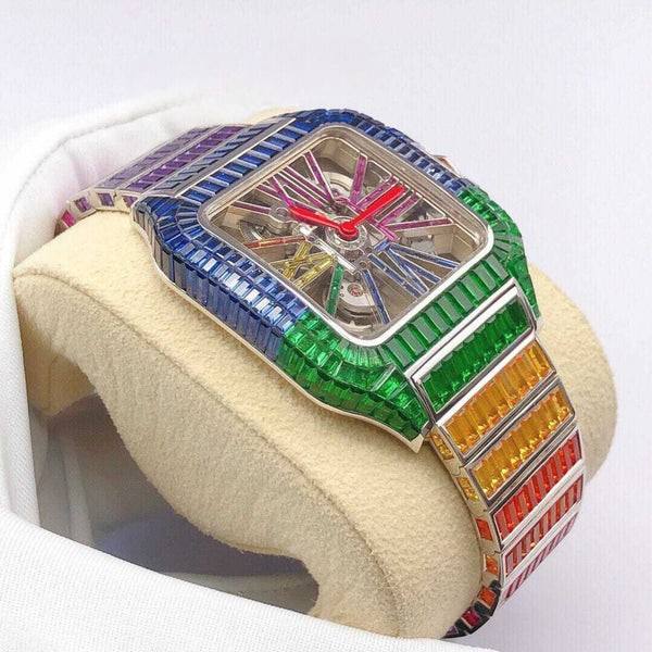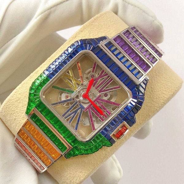 นาฬิกาแฟชั่นสำหรับผู้ชายทรงบาแกตต์ประดับเพชรสีสันสดใสงานกลไกอัตโนมัติแนวฮิปฮอป