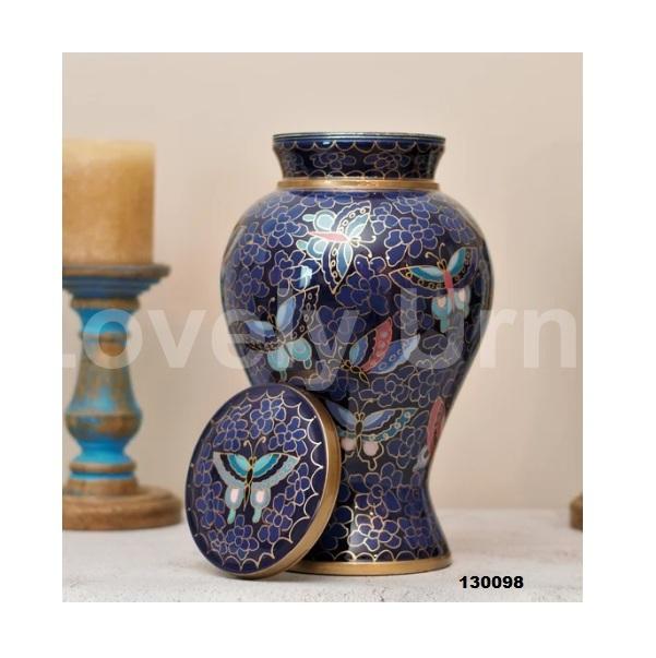ภาพวาดมือผีเสื้อคลาสสิกโกศดอกไม้รอยัลสีน้ำเงินสำหรับขี้เถ้ามนุษย์พร้อมถุงกำมะหยี่