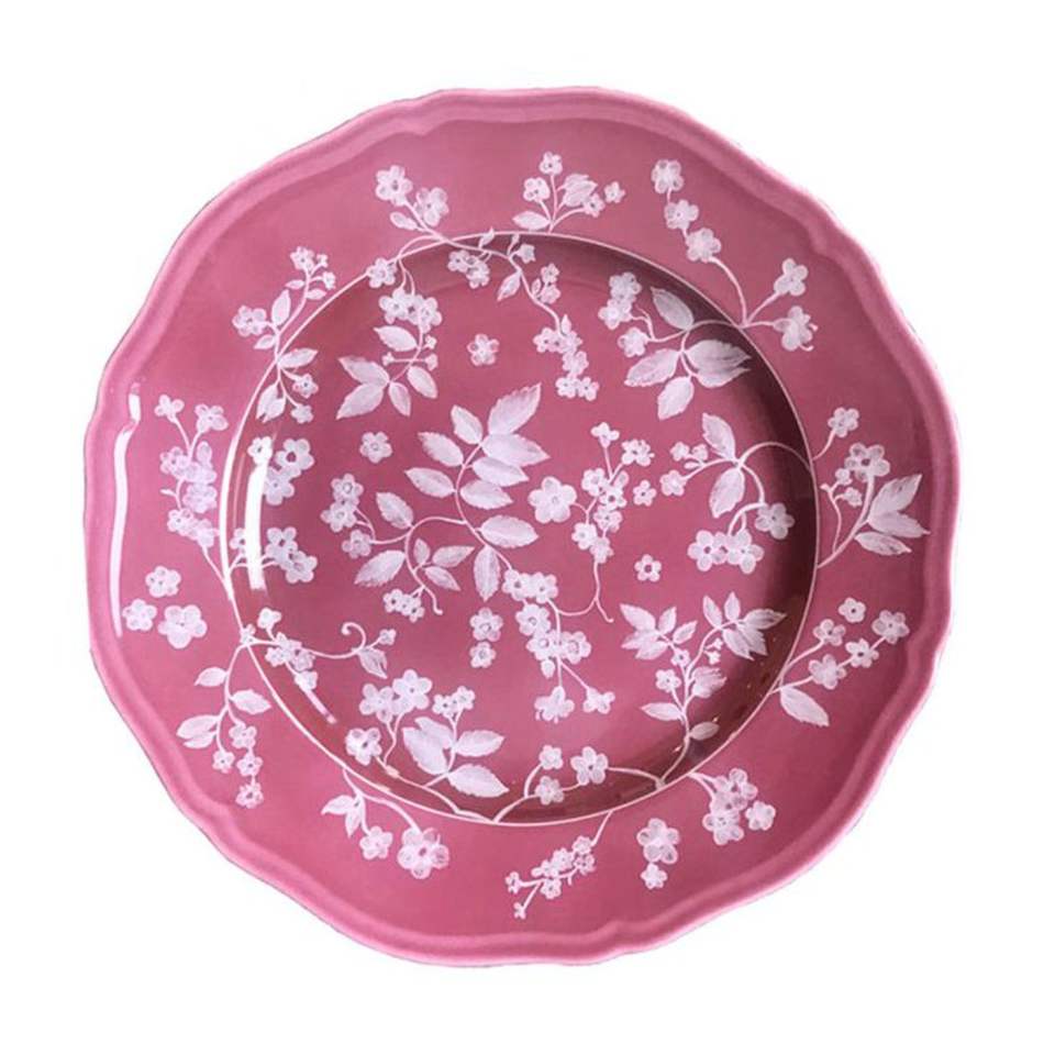 จานรองโลหะสีชมพูลายดอกไม้เพ้นท์มือ ขนาด 13 นิ้ว ทรงกลมเคลือบเงา สำหรับตกแต่งโต๊ะงานแต่งงาน งานเลี้ยง และงานอีเว้นท์ต่างๆ