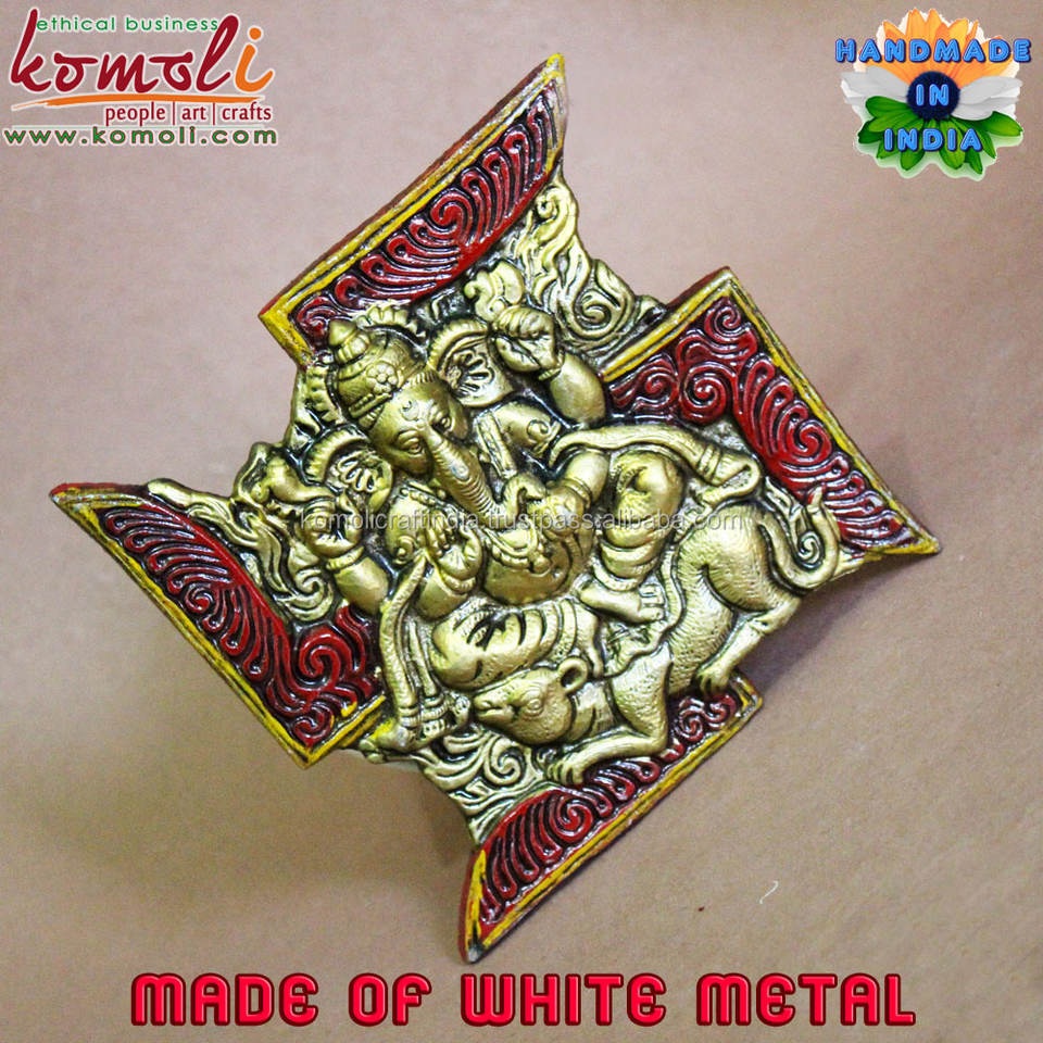 ที่แขวนผนังพระพิฆเนศสวัสติกทาสีด้วยมือของตกแต่งผนังพระพิฆเนศโทนสีทองเหลืองศิลปะบ้านและวัดแบบดั้งเดิม