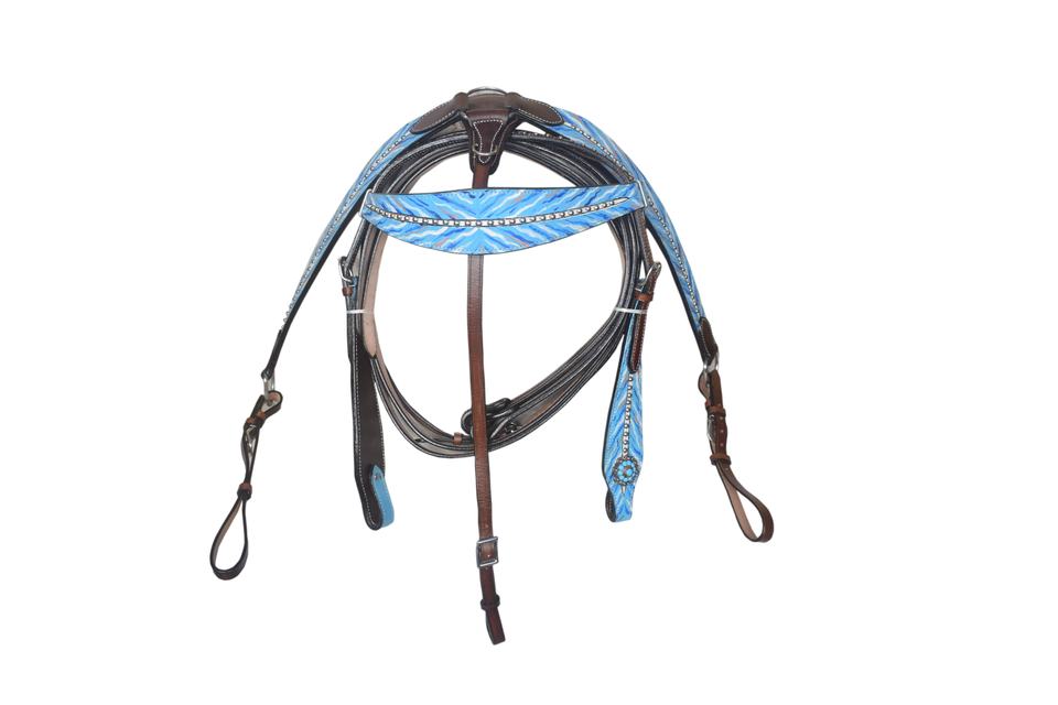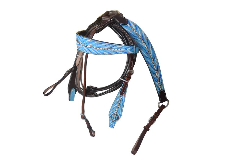 ชุดหัวม้าขาวและเทาหนังทาสีด้วยมือสีน้ำตาลสีเทอร์ควอยซ์และสีขาว