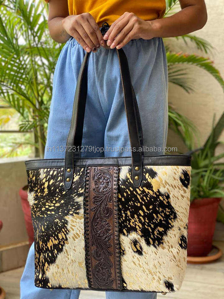 มือเครื่องมือแกะสลักกระเป๋าถือ Tote กระเป๋าหนัง Cowhide จริงผมบนซ่อนขนสัตว์กระเป๋าขนาดใหญ่คอลเลกชันสุภาพสตรีกระเป๋า
