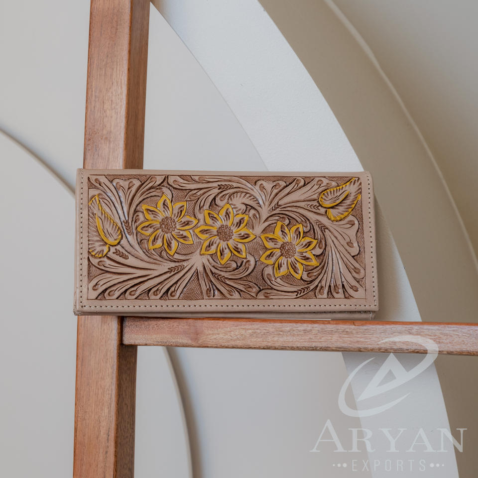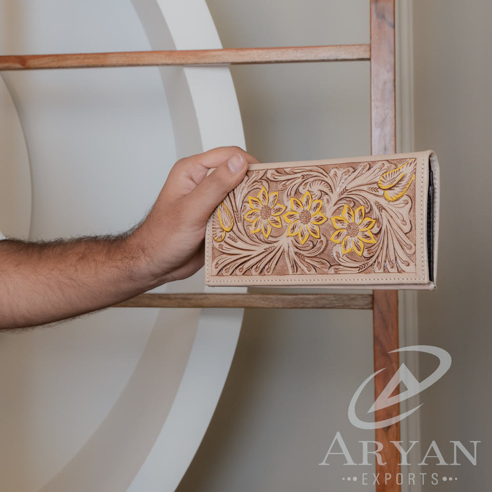Hand Tooled Carving Leather Men's Long Wallet Western Style Hot Sale Fashion Stylish Green Flower Cash Holder Gift for Him
