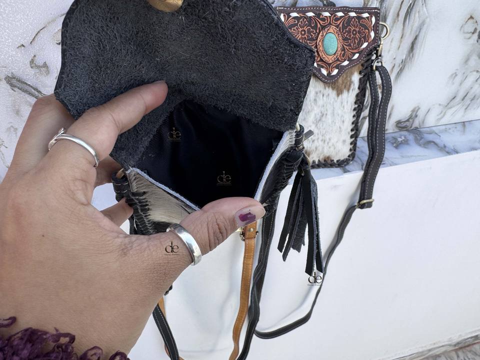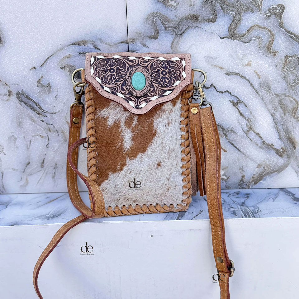 กระเป๋าหนังสลิงลายแกะสลักด้วยมือประดับด้วยหินเทอร์ควอยซ์ ขนาดเล็ก ใส่โทรศัพท์ได้ กระเป๋าถือหนังขนสัตว์ กระเป๋าคล้องมือ