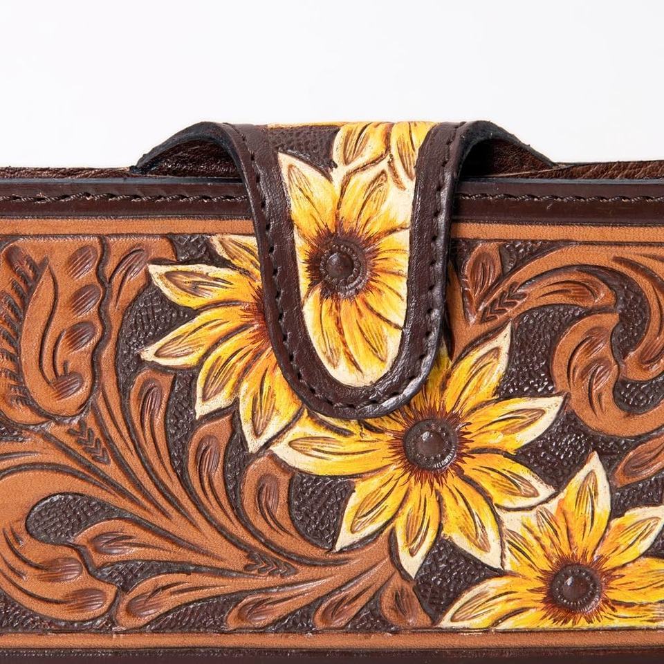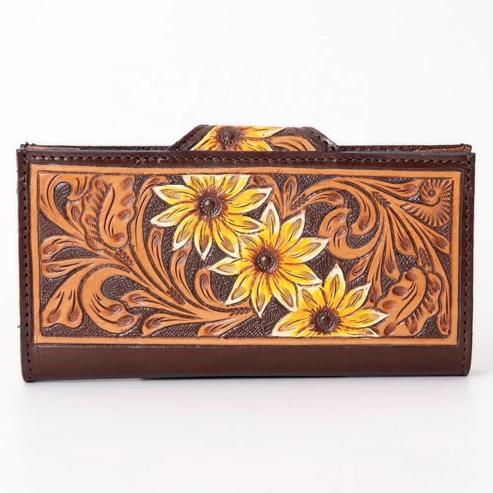 กระเป๋าสตางค์หนังสไตล์ตะวันตกสำหรับผู้หญิงลายดอกดวงอาทิตย์สีเหลืองรูปดอกไม้ประดิษฐ์ด้วยมือ