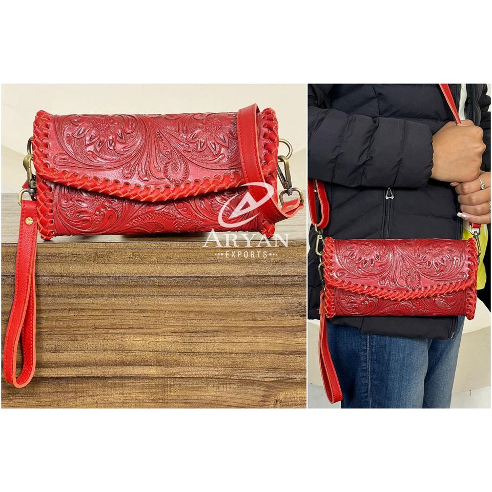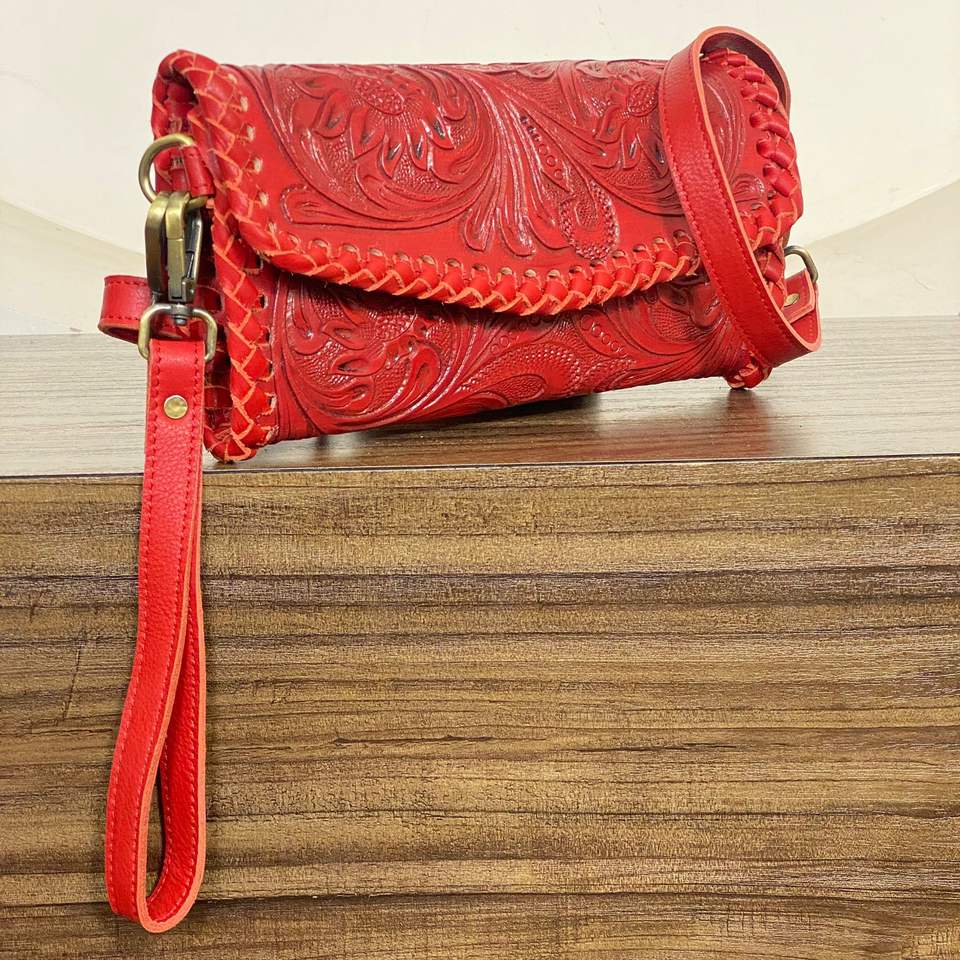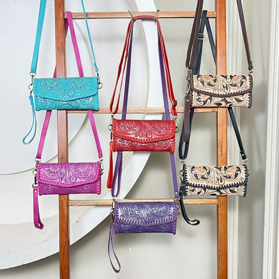 กระเป๋าหนังแท้ลายดอกไม้สลักลายด้วยมือสำหรับผู้หญิง พร้อมสายคล้องมือ ช่องใส่บัตร และช่องซิป