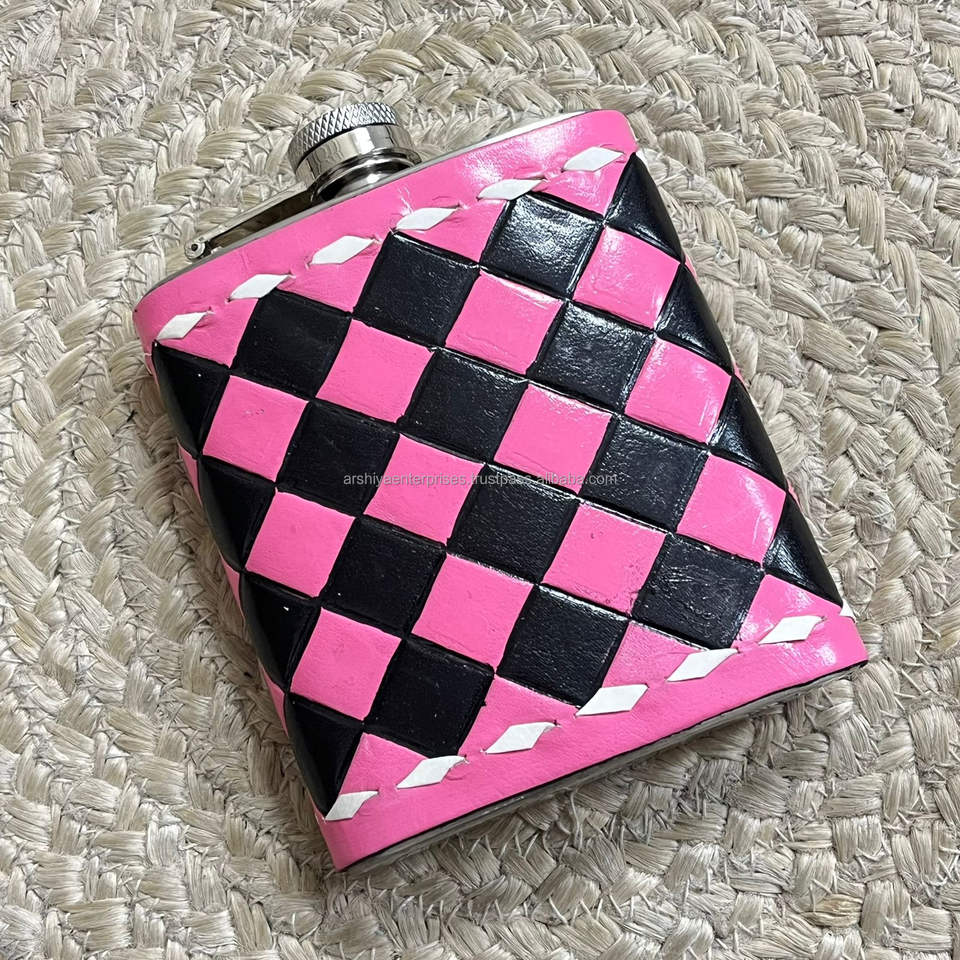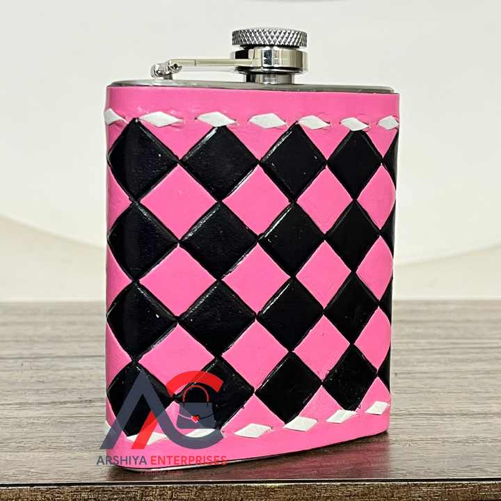 กระติกน้ำทรงเหลี่ยมลายตารางหุ้มหนังแท้แกะสลักด้วยมือ ขนาด 7 ออนซ์ ทำจากสแตนเลส เหมาะสำหรับใส่เหล้าวิสกี้ วอดก้า ใช้สำหรับตั้งแคมป์ หรือเป็นของขวัญ