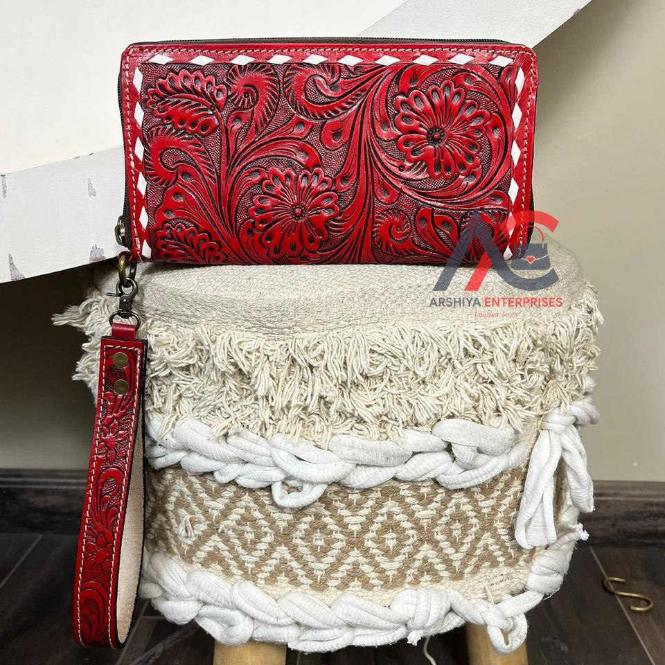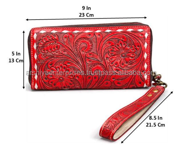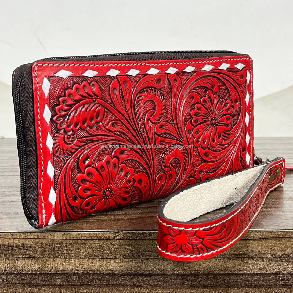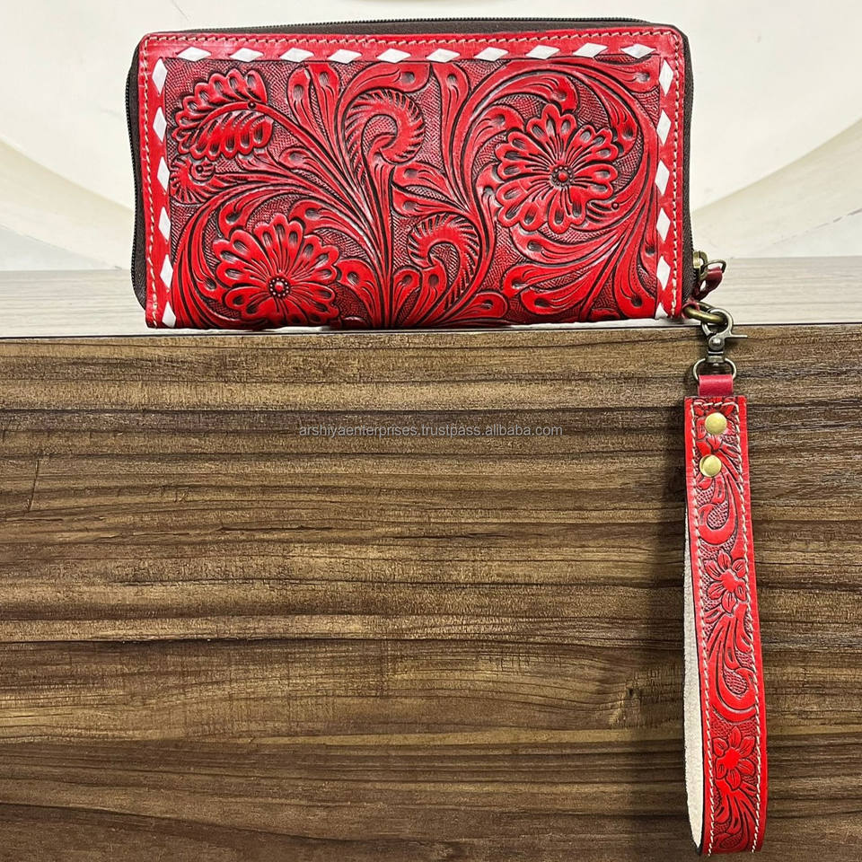 กระเป๋าสตางค์หนังแท้ลายสลักมือแบบซิปรอบพร้อมสายคล้องข้อมือ สไตล์ตะวันตก กระเป๋าคลัทช์สำหรับสุภาพสตรี พร้อมช่องใส่บัตรและช่องใส่เหรียญ