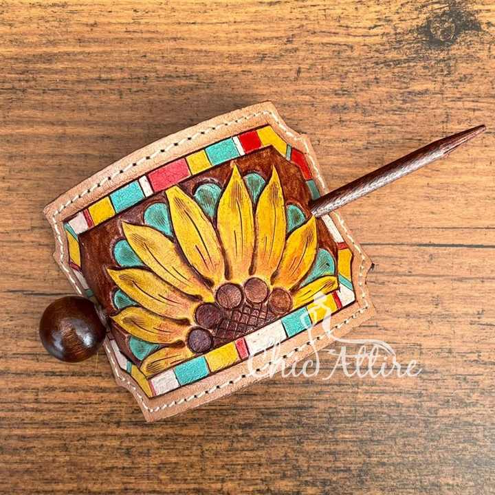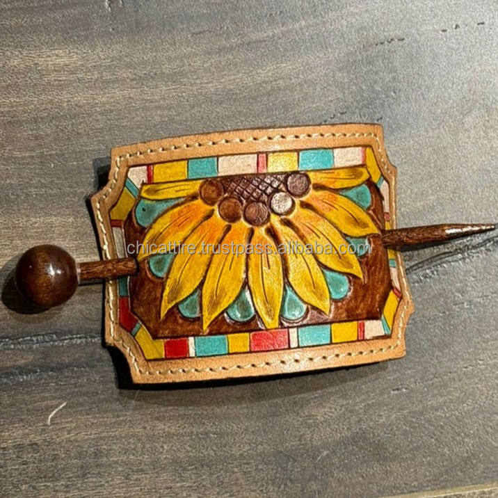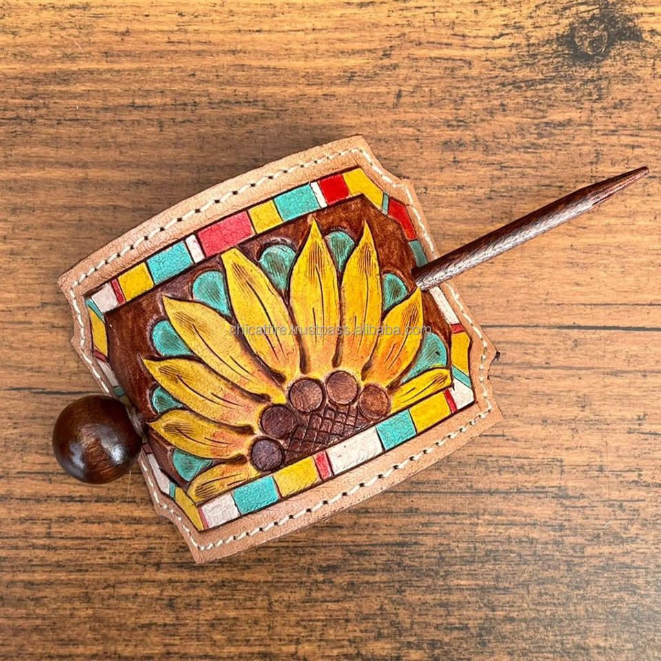 Hand Tooled Leather Hair Barrettes with Wooden Stick Cowhide Hair Slider Pins Ponytail Holders Women Accessories Hair Set Clips
