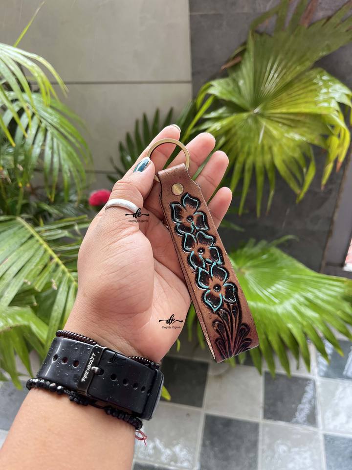 พวงกุญแจหนังแท้ลายดอกไม้สีฟ้า