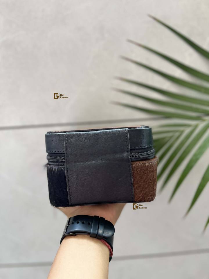 กล่องเก็บเครื่องสำอางหนังที่มีสไตล์พร้อมเครื่องมือที่ทำด้วยมือสีเทอร์ควอยซ์โต๊ะเครื่องแป้งที่จัดระเบียบในห้องน้ำมีซิปปิดสไตล์แฟชั่น
