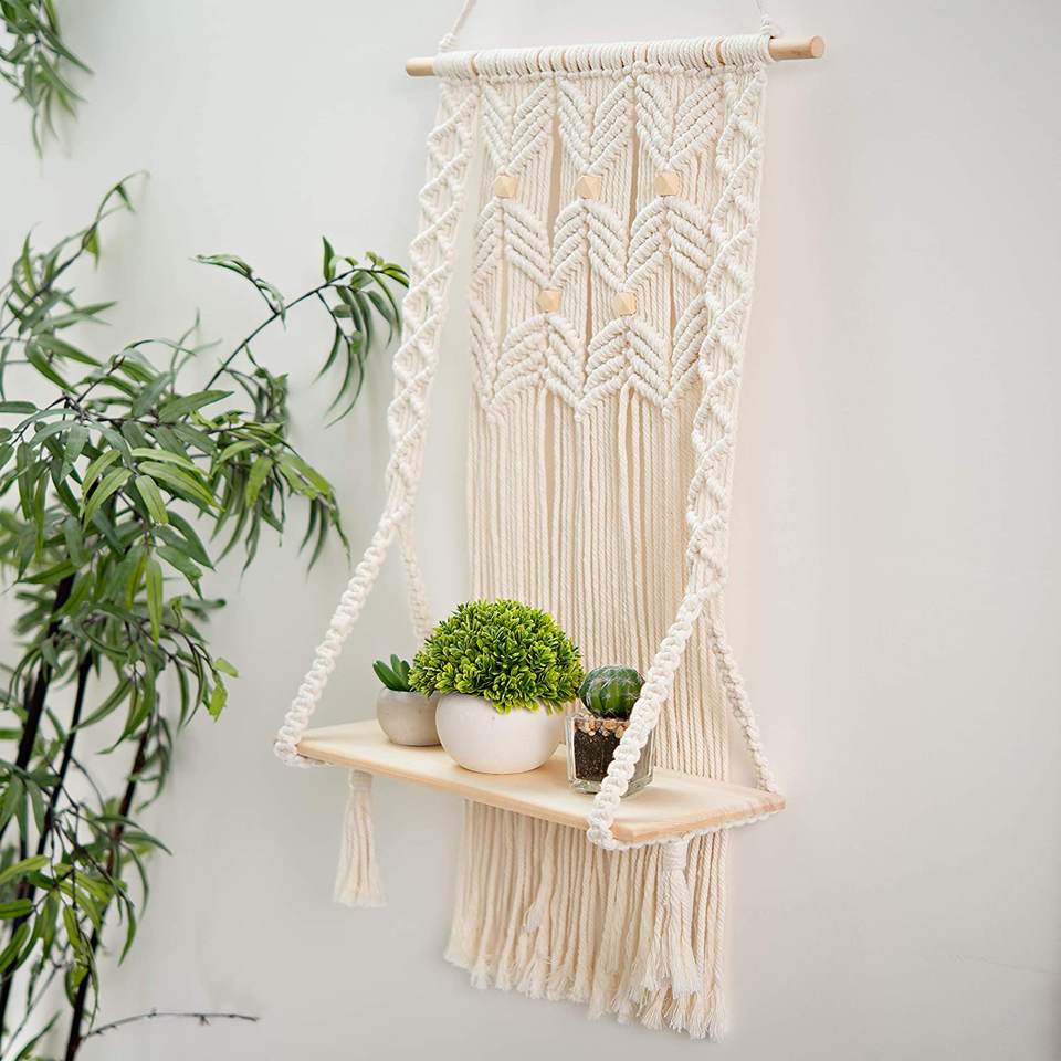 แจกันแขวนผนังโบฮีเมียนแบบถักด้วยมือพร้อมชั้นวางของแบบลอยสำหรับตกแต่งห้องนั่งเล่นแจกันติดผนังเทคนิคแฮนด์เมด