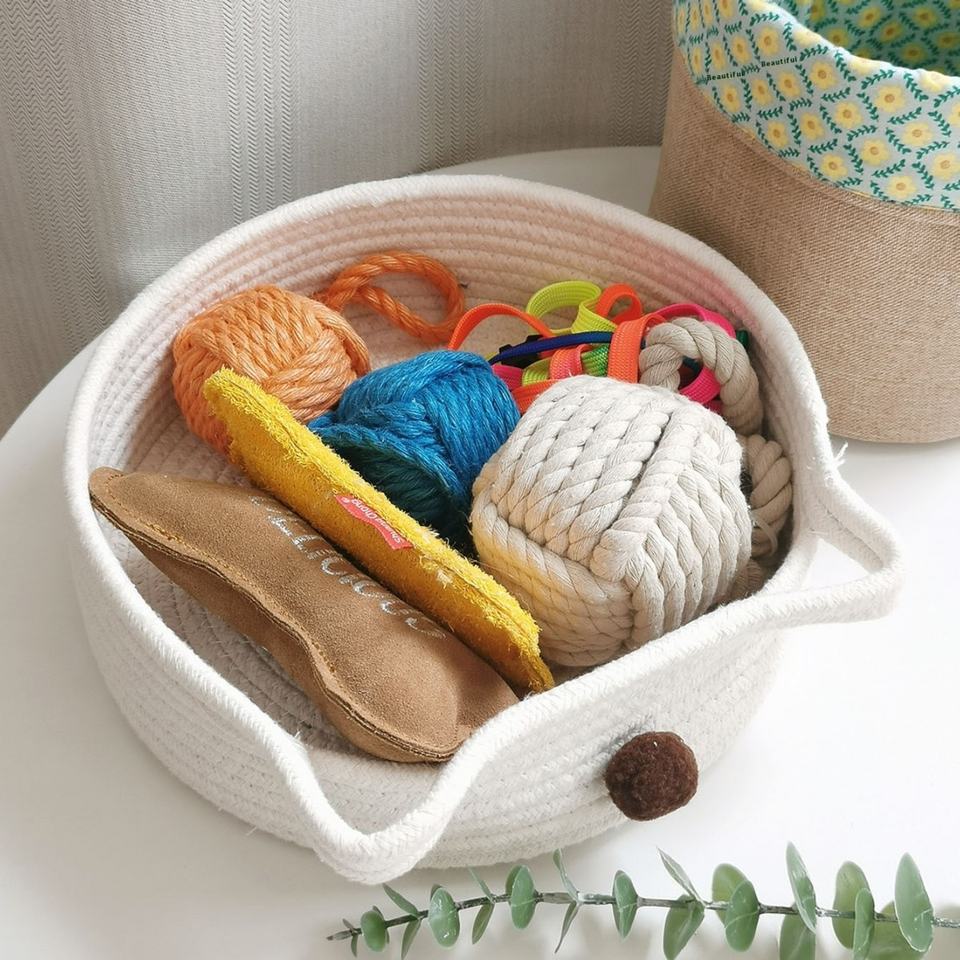 ตะกร้าเก็บของเล่นสัตว์เลี้ยง ทำจากเชือกฝ้ายทอมือ ใช้เป็นที่เก็บของบนโต๊ะ ใส่กุญแจ ขนม ของจิปาถะสำหรับสัตว์เลี้ยง