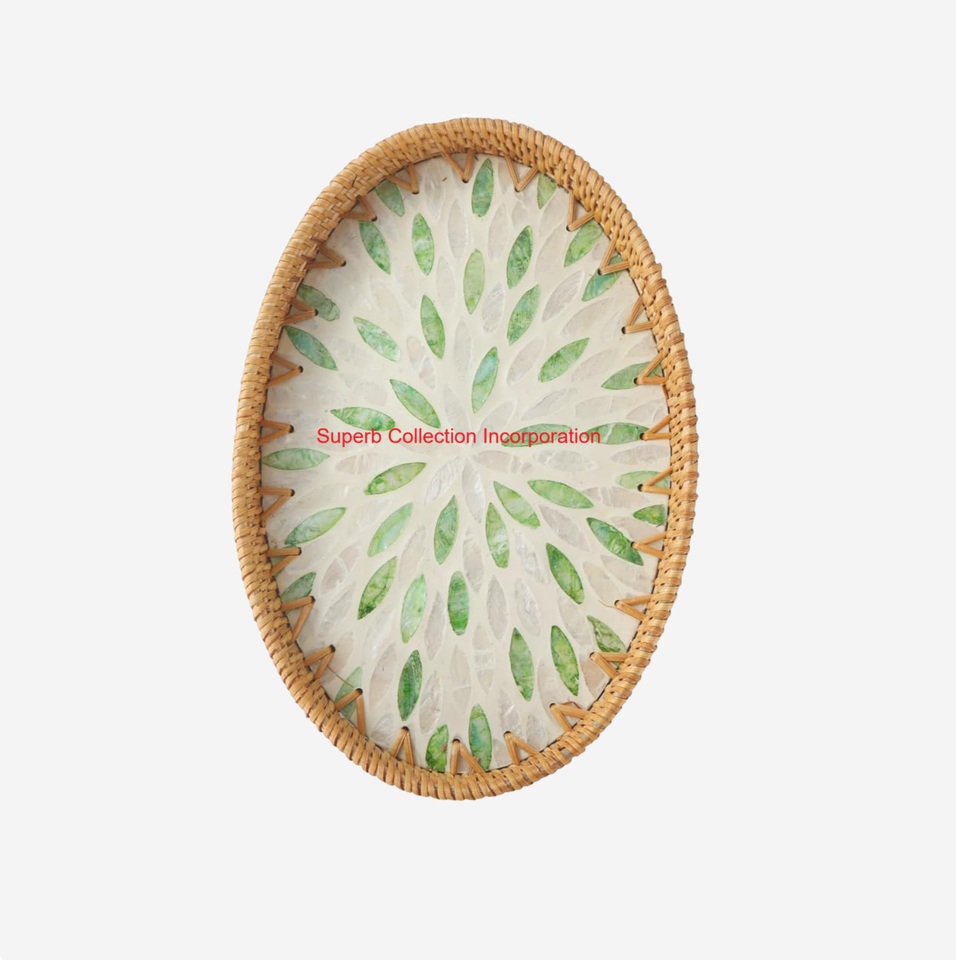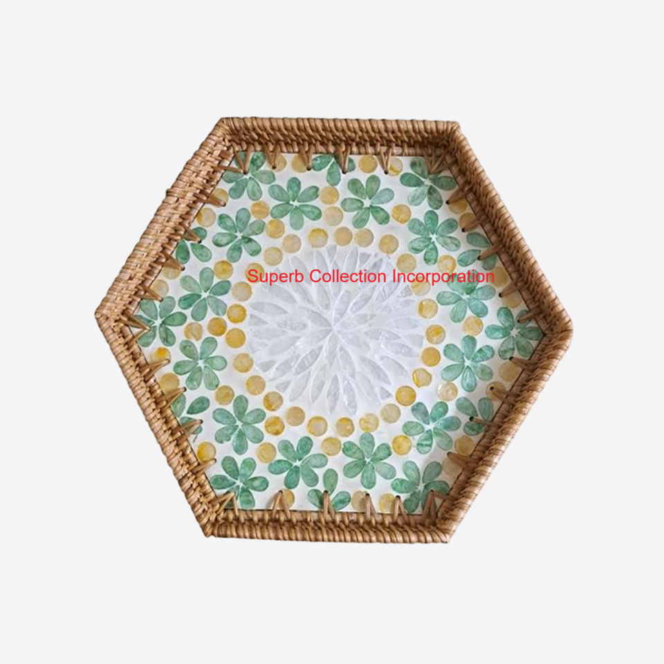 ถาดรองหวายทรงหกเหลี่ยมสานด้วยมือพร้อมถาดสำหรับวางบนโต๊ะกาแฟธรรมชาติฝังมุกสำหรับตกแต่งบ้านและจัดห้องครัว