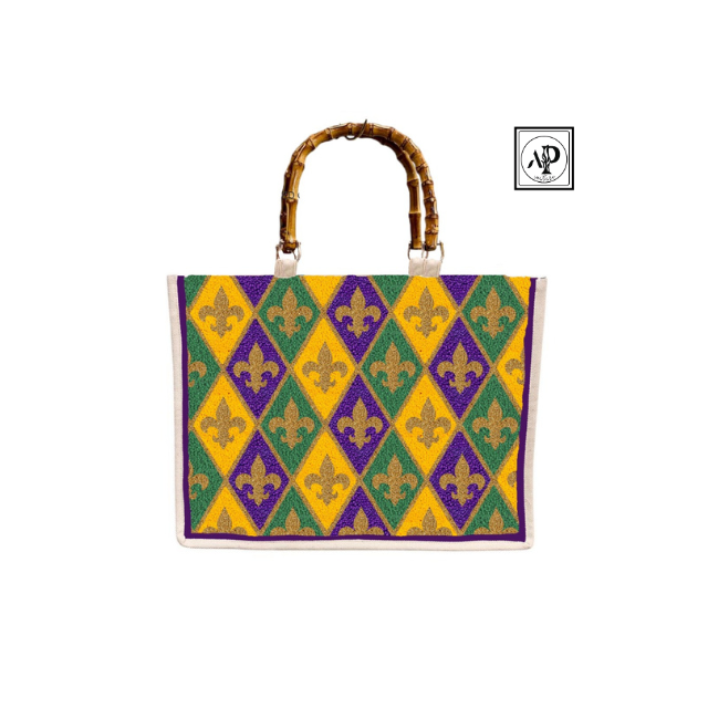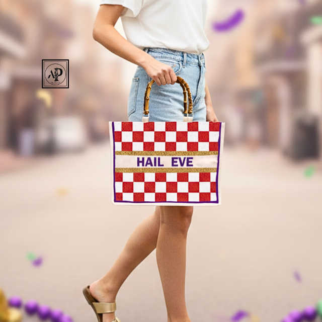 กระเป๋าโท้ท HAIL EVE ประดับลูกปัดด้วยมือ พร้อมดีไซน์ลายตารางหมากรุกสีแดง แต่งกลิตเตอร์ และหูหิ้วไม้ไผ่ เพื่อการพกพาที่มีสไตล์ในชีวิตประจำวัน