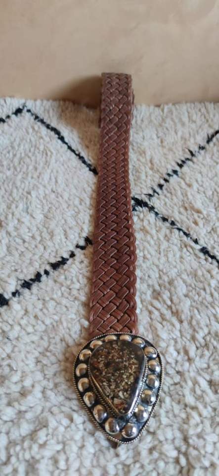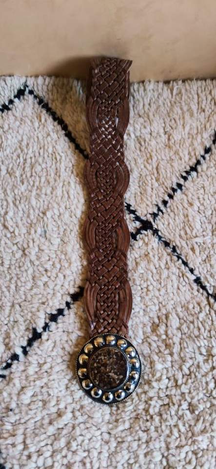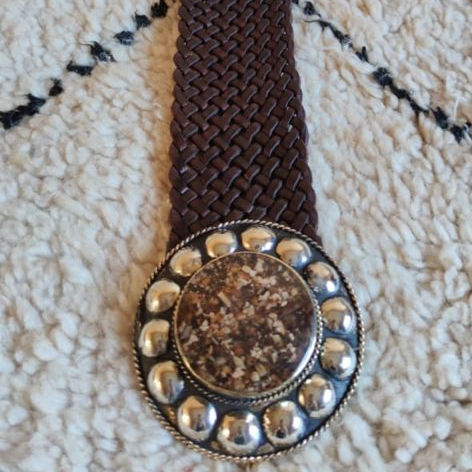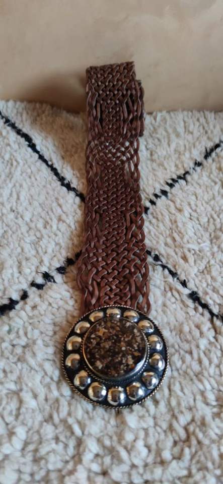 เข็มขัดหนังถักด้วยมือหัวเข็มขัดโลหะกลมพร้อมสลักฮอร์น