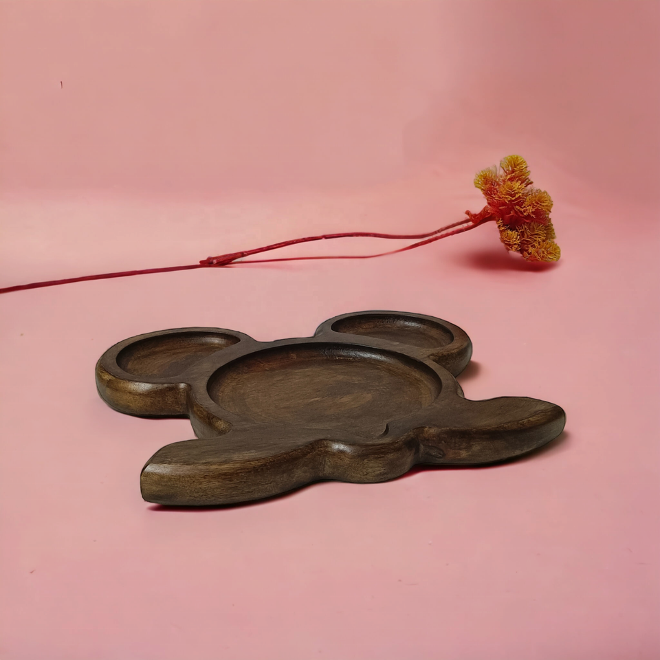 ของตกแต่งโต๊ะทำจากไม้มะม่วงที่มีรูปร่างเป็นเอกลักษณ์สีน้ำตาลเข้มของเก่าโบราณที่ทำด้วยมือสำหรับเสิร์ฟผลไม้แห้งของตกแต่งโต๊ะ