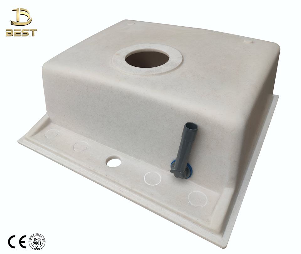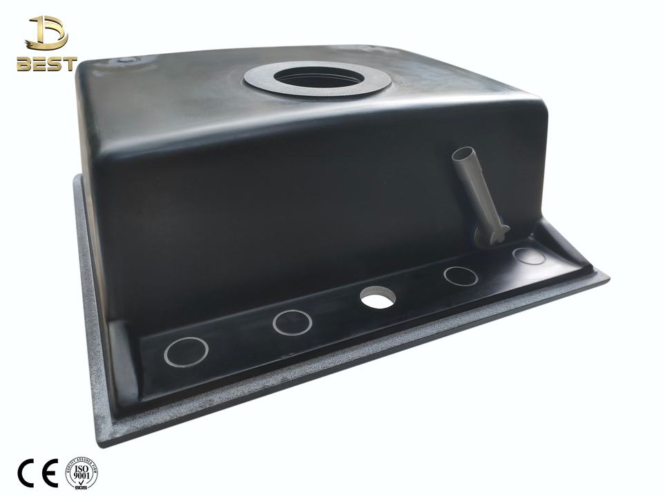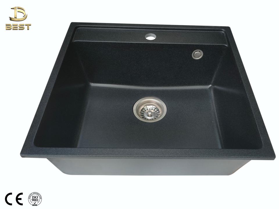 อ่างล้างจานแบบถ้วยเดียวทำจากควอตซ์สีดำทำมือไม่มีก๊อกน้ำทำจากวัสดุหินแกรนิตคอมโพสิตที่ระบายน้ำสแตนเลส