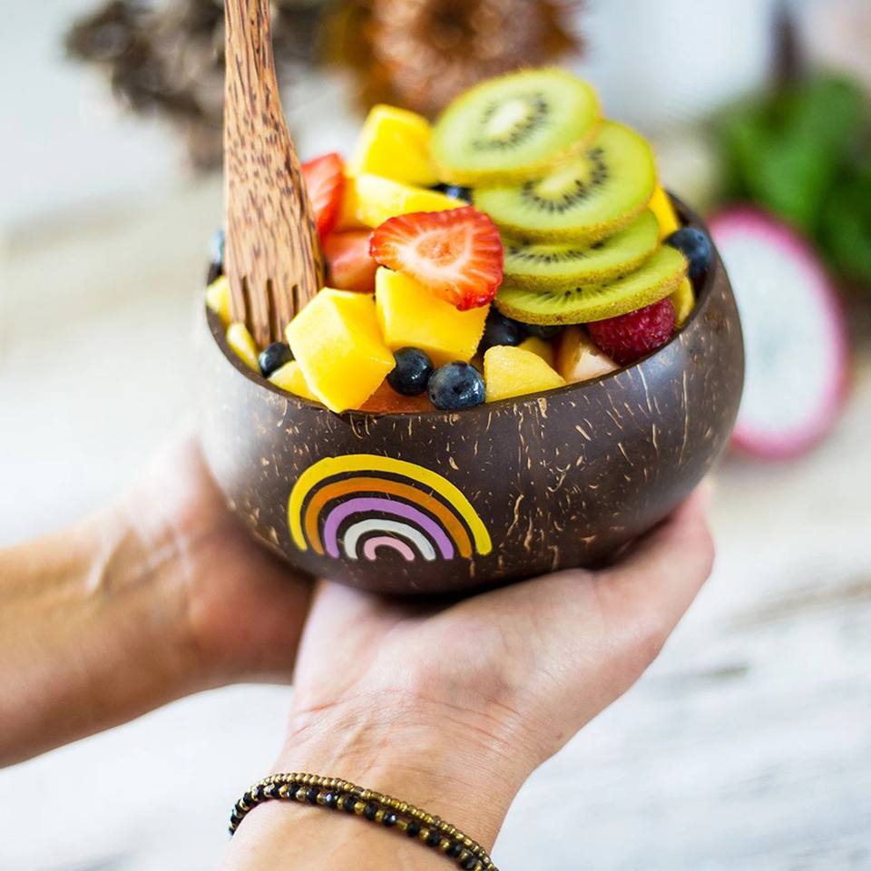 ชามมะพร้าววินเทจสีรุ้งเป็นมิตรกับสิ่งแวดล้อมทาสีด้วยมือชุด 4 ชามและช้อน ปรับแต่งบรรจุภัณฑ์โลโก้ ODM ผลิตในเวียดนาม