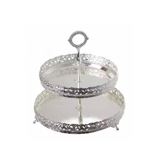 ขาตั้งเค้กโลหะ2ชั้นทำจากเงินด้วยมือมีรายละเอียดแกะสลักและรูปร่างที่สมดุลเหมาะสำหรับการนำเสนอและบริการ
